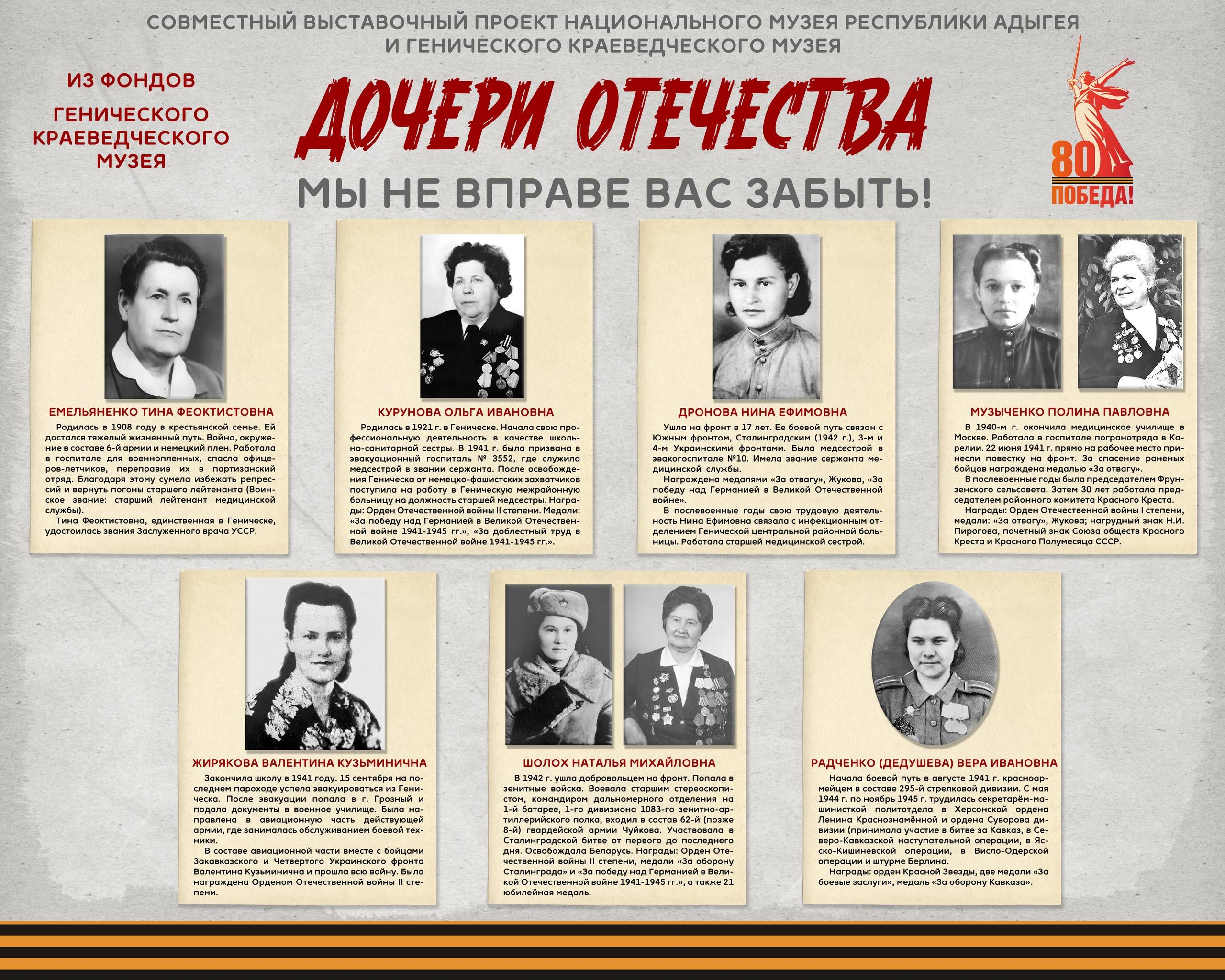 К Дню памяти и скорби, который ежегодно отмечается в России 22 июня, Национальный музей Республики Адыгея совместно с Геническим краеведческим музеем подготовили проект «Дочери Отечества. Мы не вправе вас забыть».