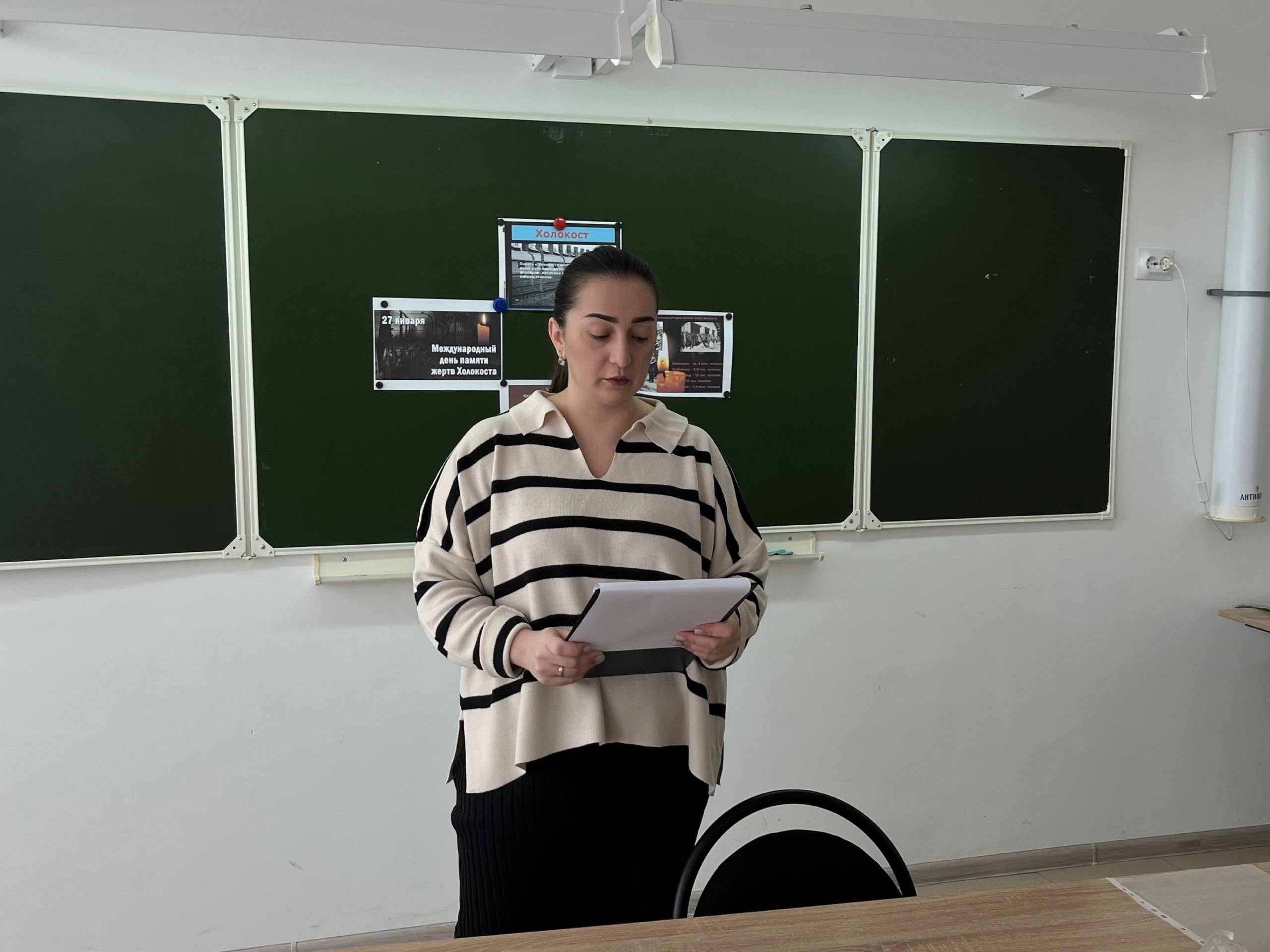 27 января сотрудники музея «Дом 1 съезда Советов Адыгеи» провели лекцию «Холокост — память поколений» для девятиклассников Хакуринохабльской СОШ №1. Учащимся рассказали о трагедии Холокоста. Это не только трагедия еврейского народа, но и катастрофа всего человечества, кризис мировой цивилизации. Мы не должны забывать об этом и обязаны передавать знания детям. Память о Холокосте важна, чтобы наши дети никогда не стали жертвами, палачами или равнодушными наблюдателями.