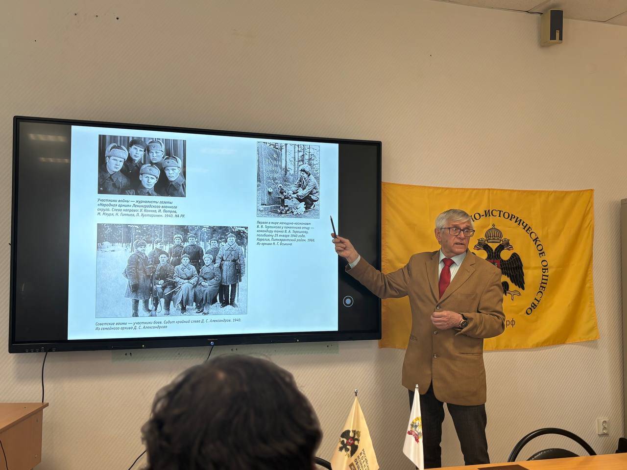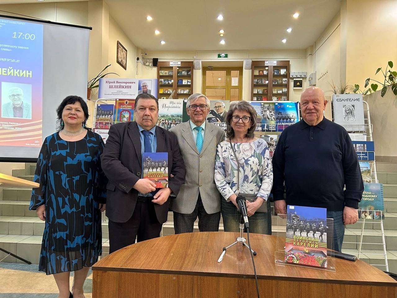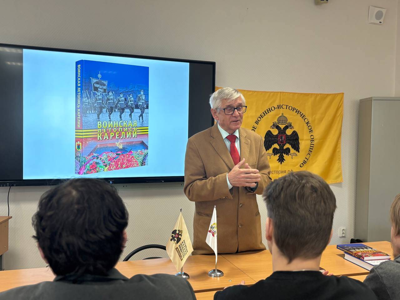 2 и 3 апреля в читальном зале Научной библиотеки Петрозаводского университета и в учебной аудитории Президентской академии прошли творческие встречи с заслуженным журналистом РФ и РК, почетным гражданином Петрозаводска, членом Совета регионального отделения РВИО Юрием Шлейкиным. Автор-составитель представил новую книгу «Воинская летопись Карелии», в которой в популярной форме рассказывается о главных военных событиях на территории современной Карелии с древнейших времен до наших дней. События многих войн, прежде всего Северной, Гражданской, Советско-финляндской, Великой Отечественной, нашли отражение в книге.