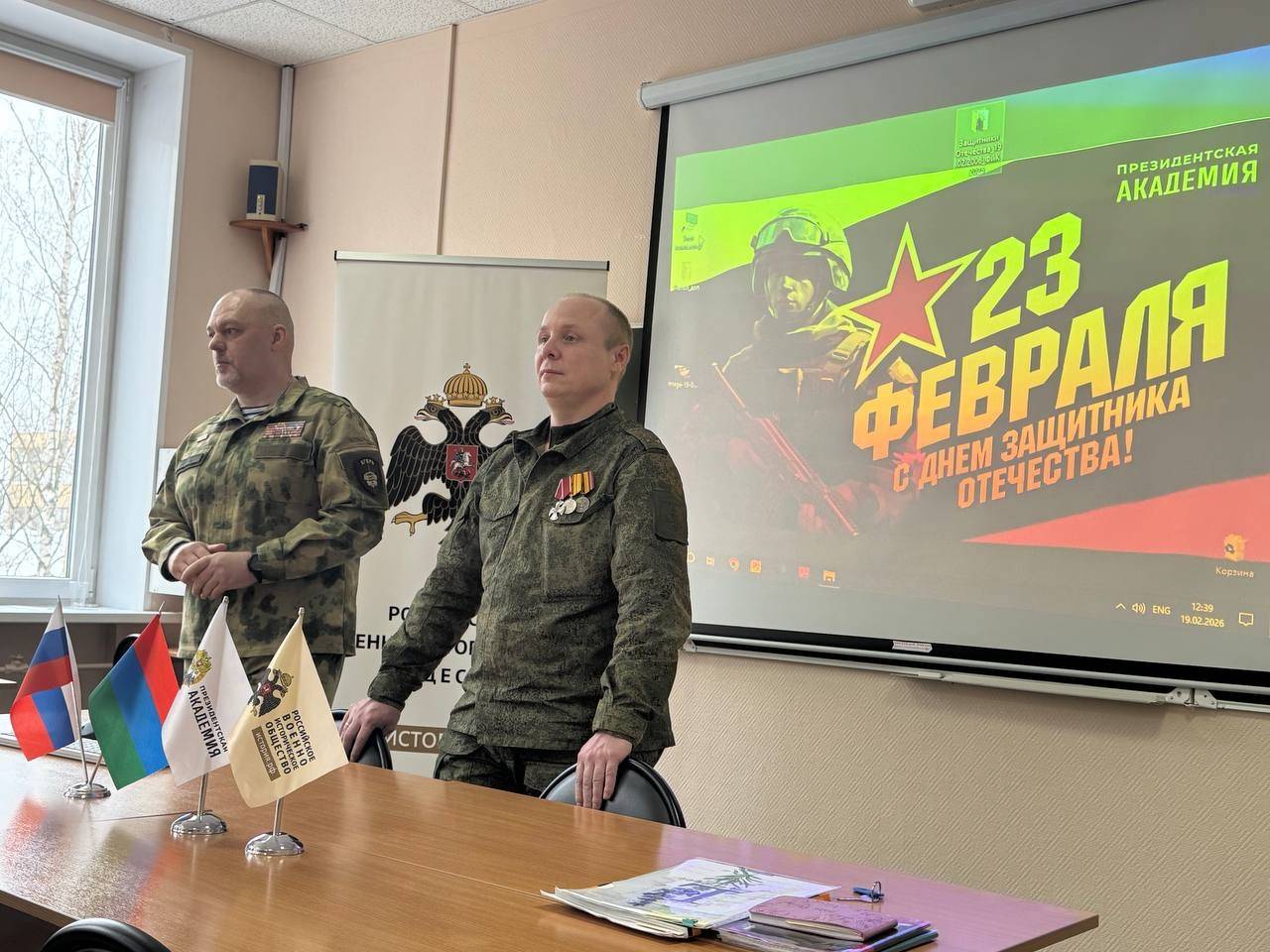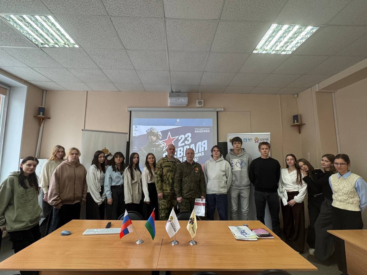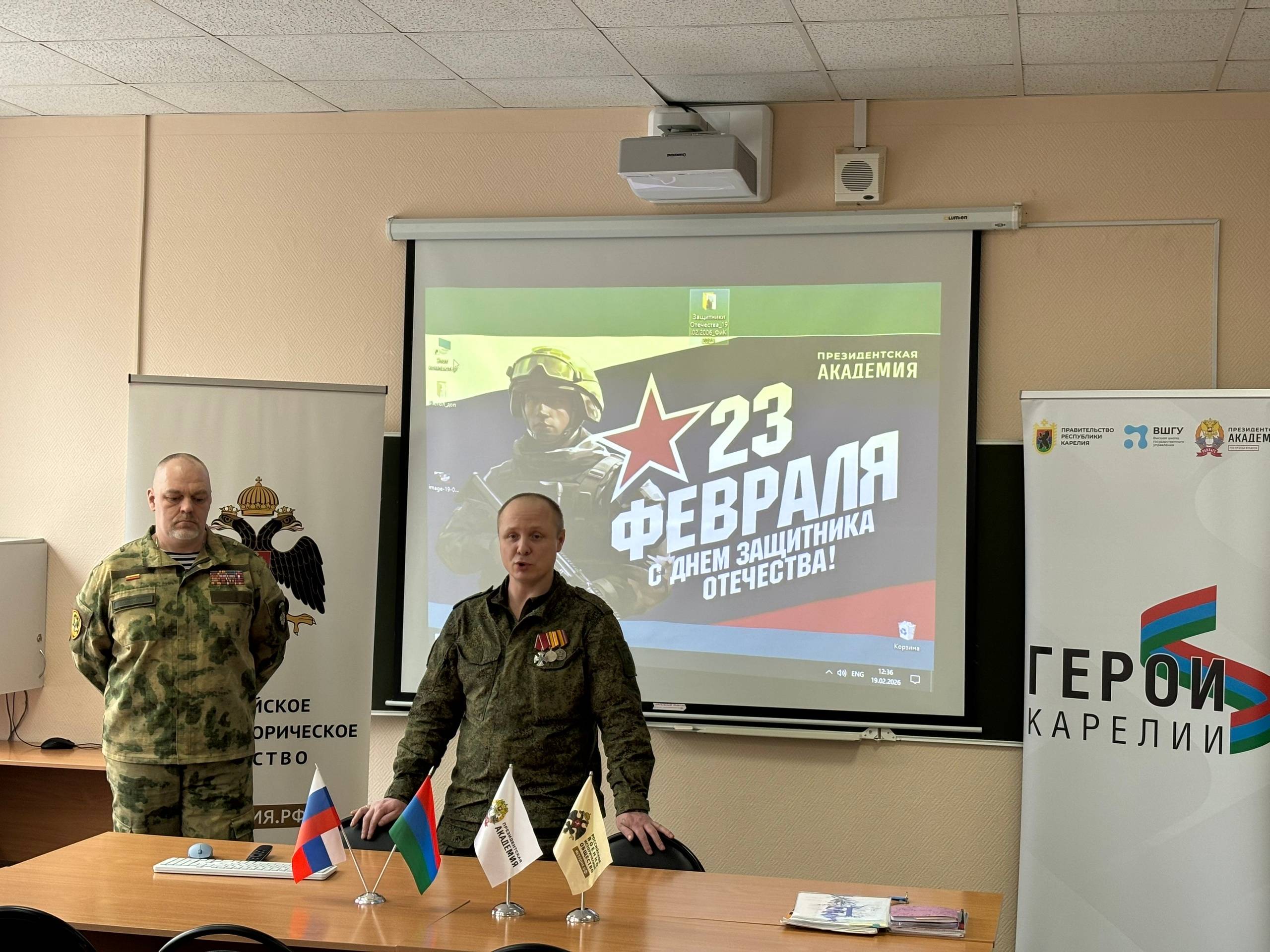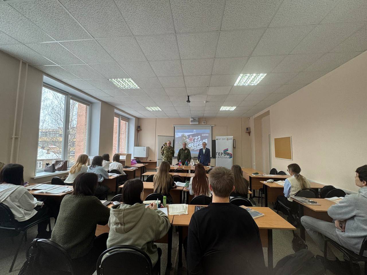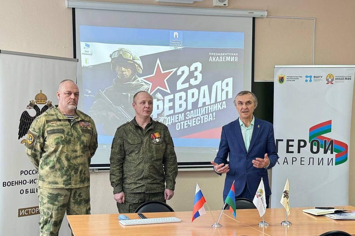 В преддверии Дня защитника Отечества в Петрозаводске при поддержке регионального отделения Российского военно-исторического общества прошла встреча студентов- первокурсников с людьми, чья жизнь - пример доблести и служения Родине. Встречу провели ветераны боевых действий, участники кадровой региональной программы «Герои Карелии» — Александр Тикка и Александр Пожарский.