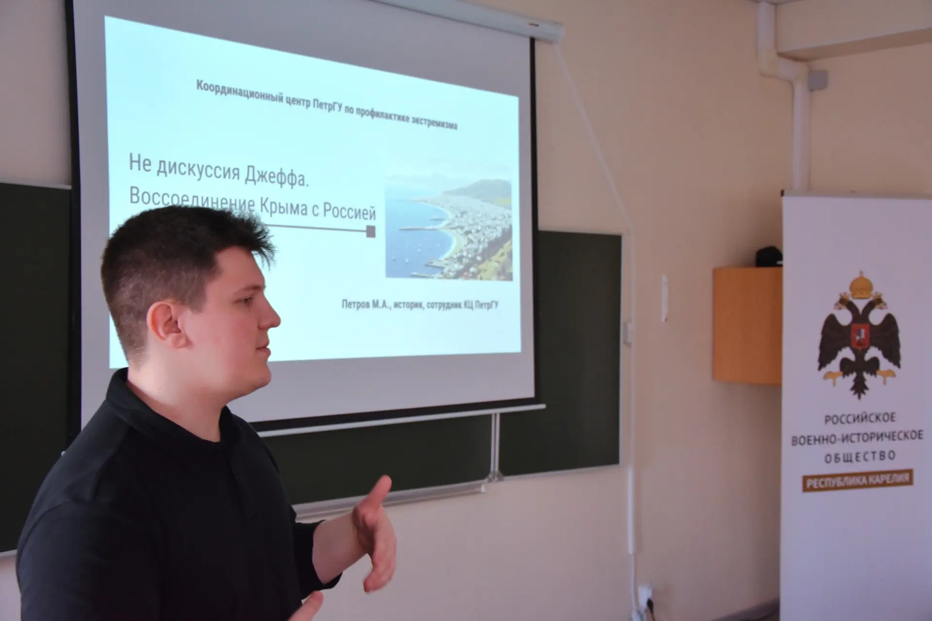 «Лекция прошла в формате «не-дискуссии Джеффа», то есть участники могли согласиться или не согласиться с утверждениями и тезисами. На основе обсуждения мы подробнее раскрыли события Крымской весны и воссоединения Крыма с Россией», — рассказал сотрудник Координационного центра ПетрГУ по профилактике экстремизма Михаил Петров.