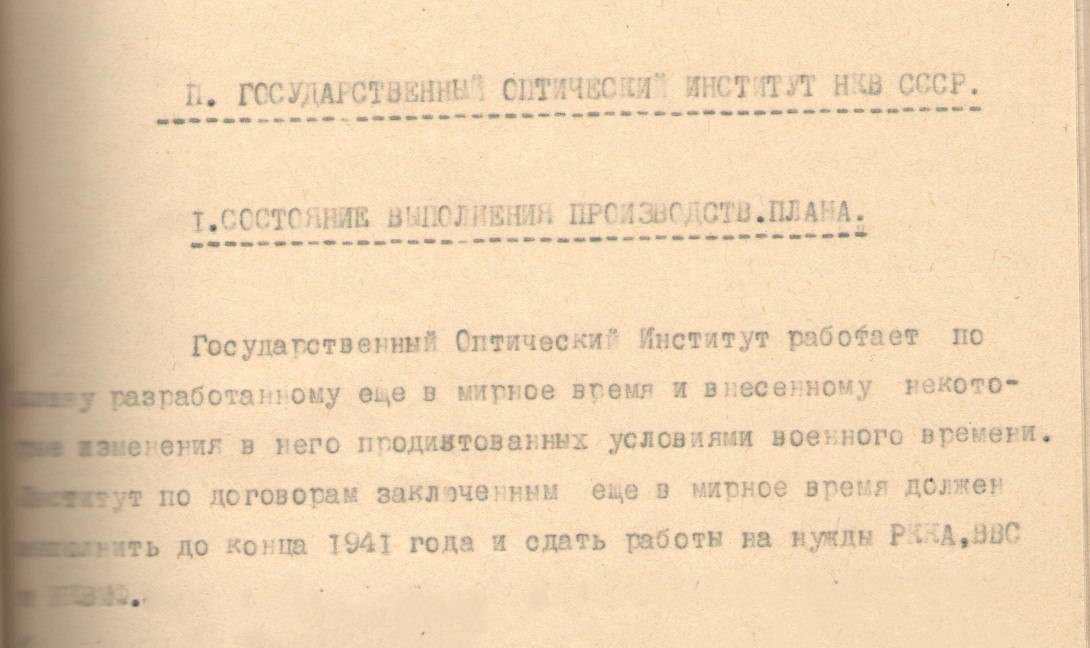 Указывалось на недостаточность агитмассовой работы и контроля дирекции за производственными точками, отсутствие квалифицированных рабочих кадров. Отмечены и сложные жилищно-бытовые условия сотрудников Государственного оптического института. Они все были обеспечены жилплощадью, но это в среднем около 3 квадратных метров на человека: в одной комнате – от двух и более семей.