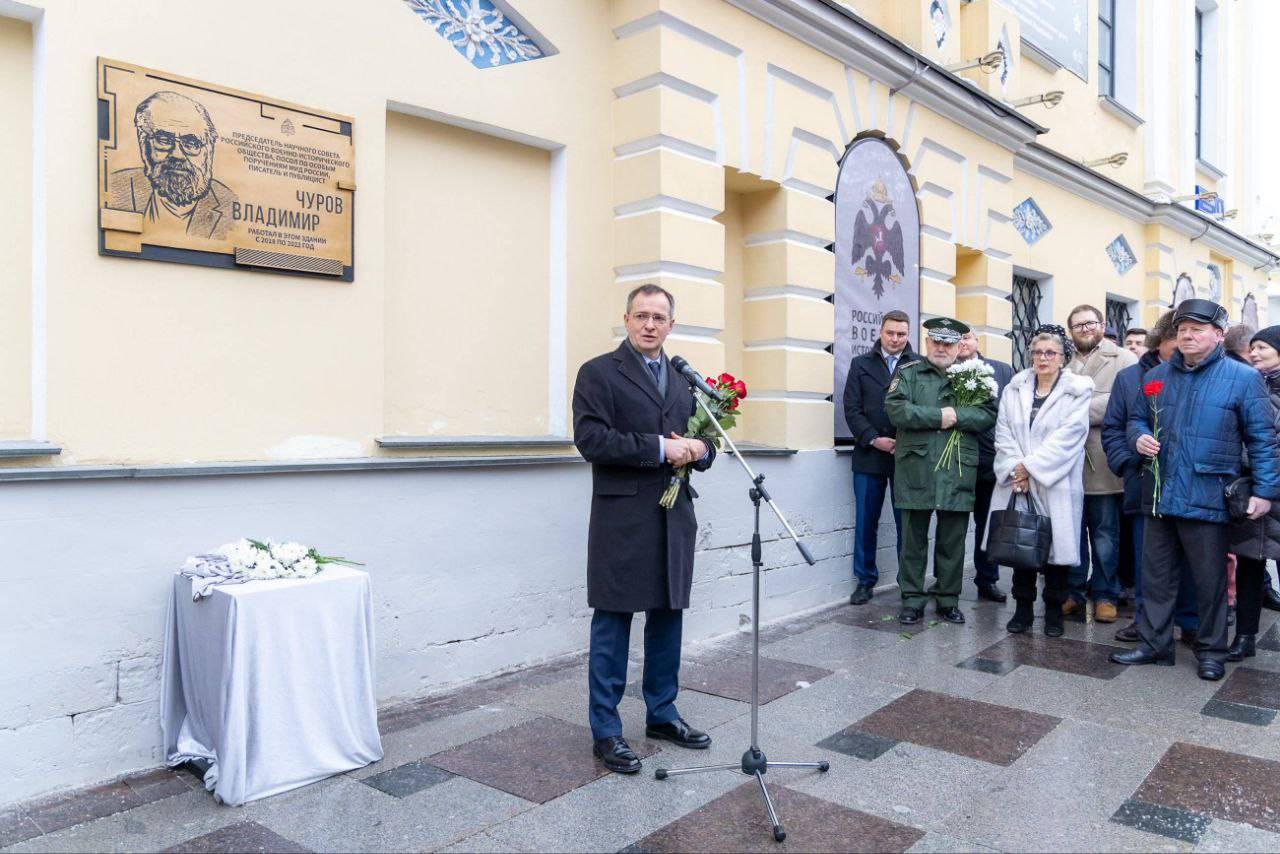 Мемориальная доска установлена Российским военно-историческим обществом на здании Штаб-квартиры РВИО, в котором работал Владимир Чуров.
