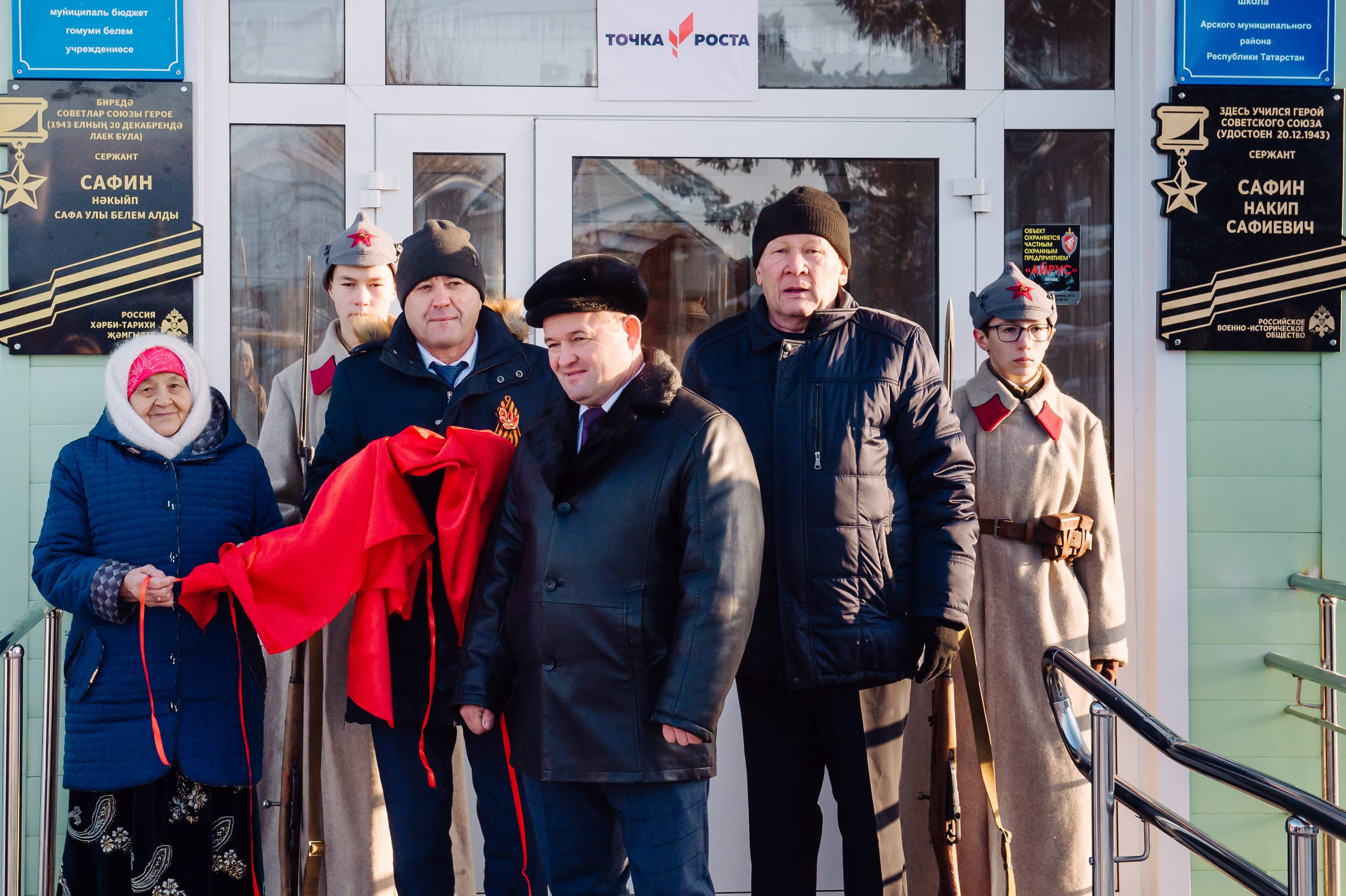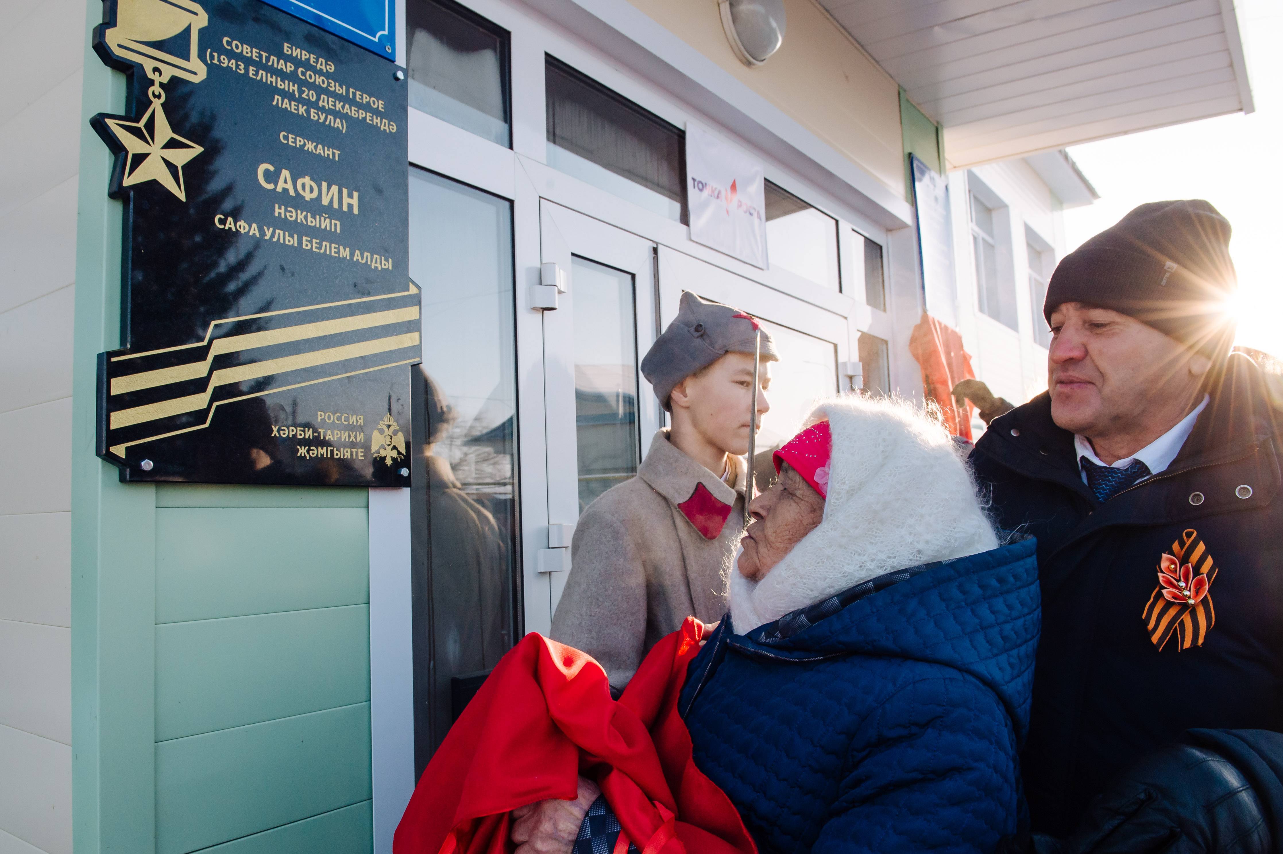 Почетное право открыть мемориальную доску Герою Советского Союза Накипу Сафину было доверено родственникам героя Сафиной Хадиче Вагизовне и Сафину Фаилю Нургаяновичу.