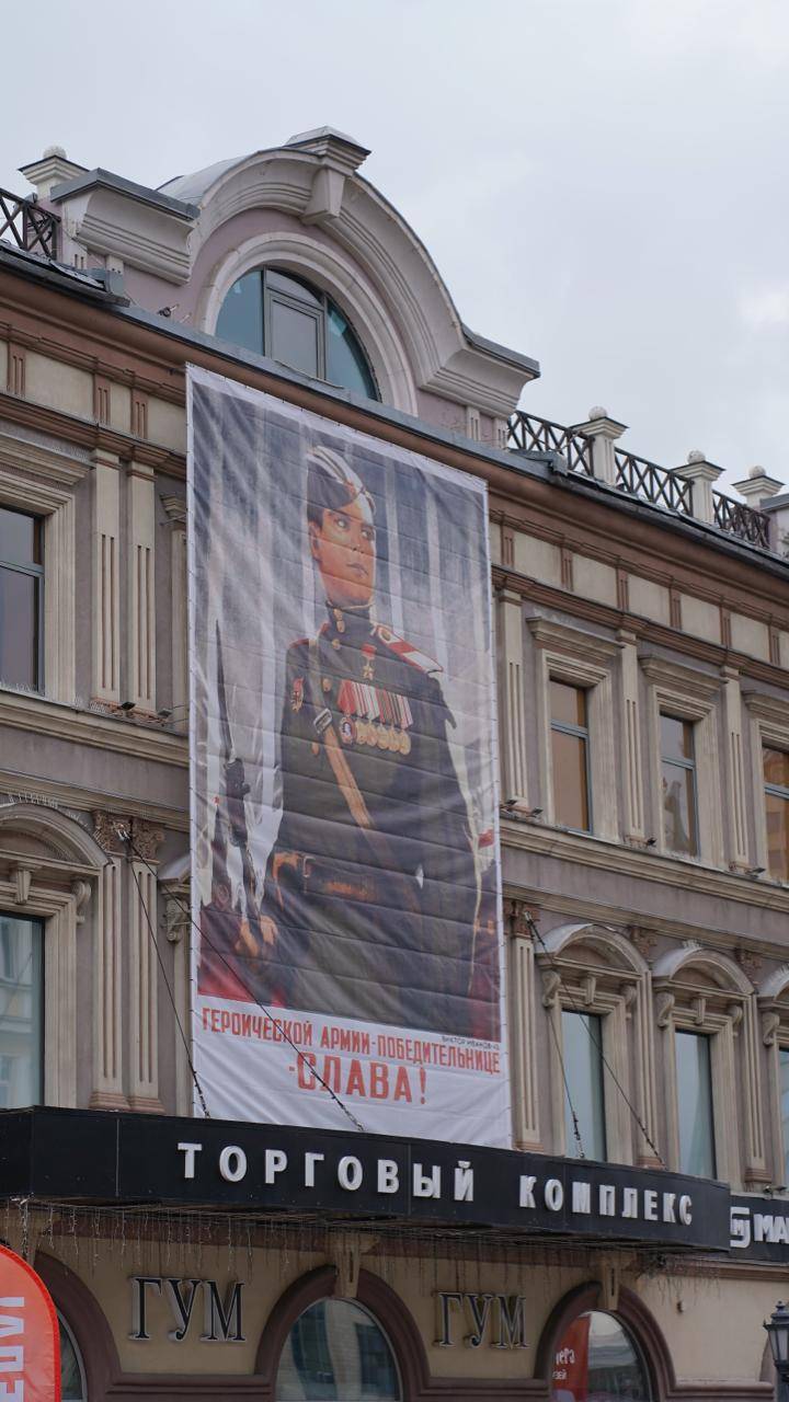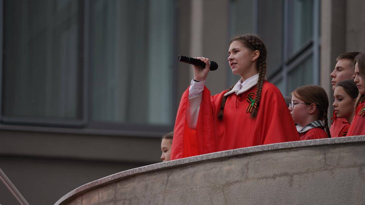 На экранах вдоль улицы оживали цифровые версии агитплакатов: анимация, звук, движение — классические образы 1940-х годов становились современными медиасигналами. Рядом шла хроника Победы, на балконах выступали артисты и чтецы с военной поэзией.