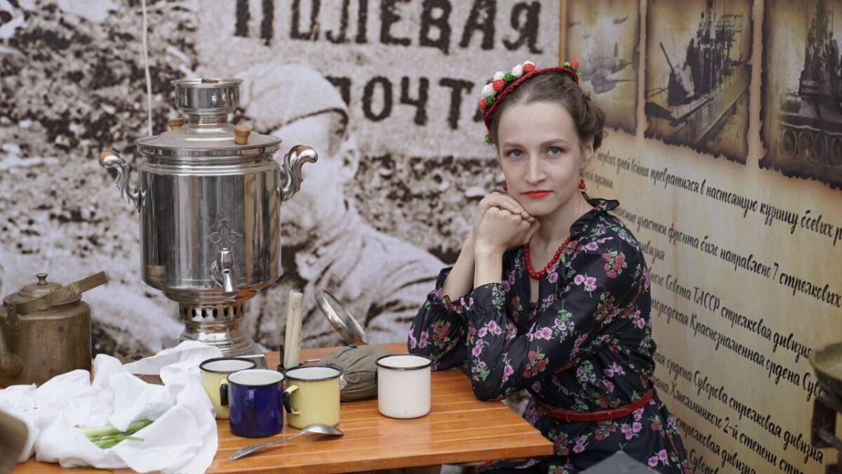 Одним из центров притяжения стала «ретро-комната» — инсталляция, воссоздающая быт 1940-х годов: швейная машинка, газеты, книги, настольная лампа с абажуром и радио в деревянном корпусе. Рядом — стилизованный блиндаж с мешками, касками, ящиками и дымящимся самоваром. Отдельная зона — полевая кухня, где можно было попробовать фронтовую кашу, как напоминание о скромных, но важных буднях военных лет.