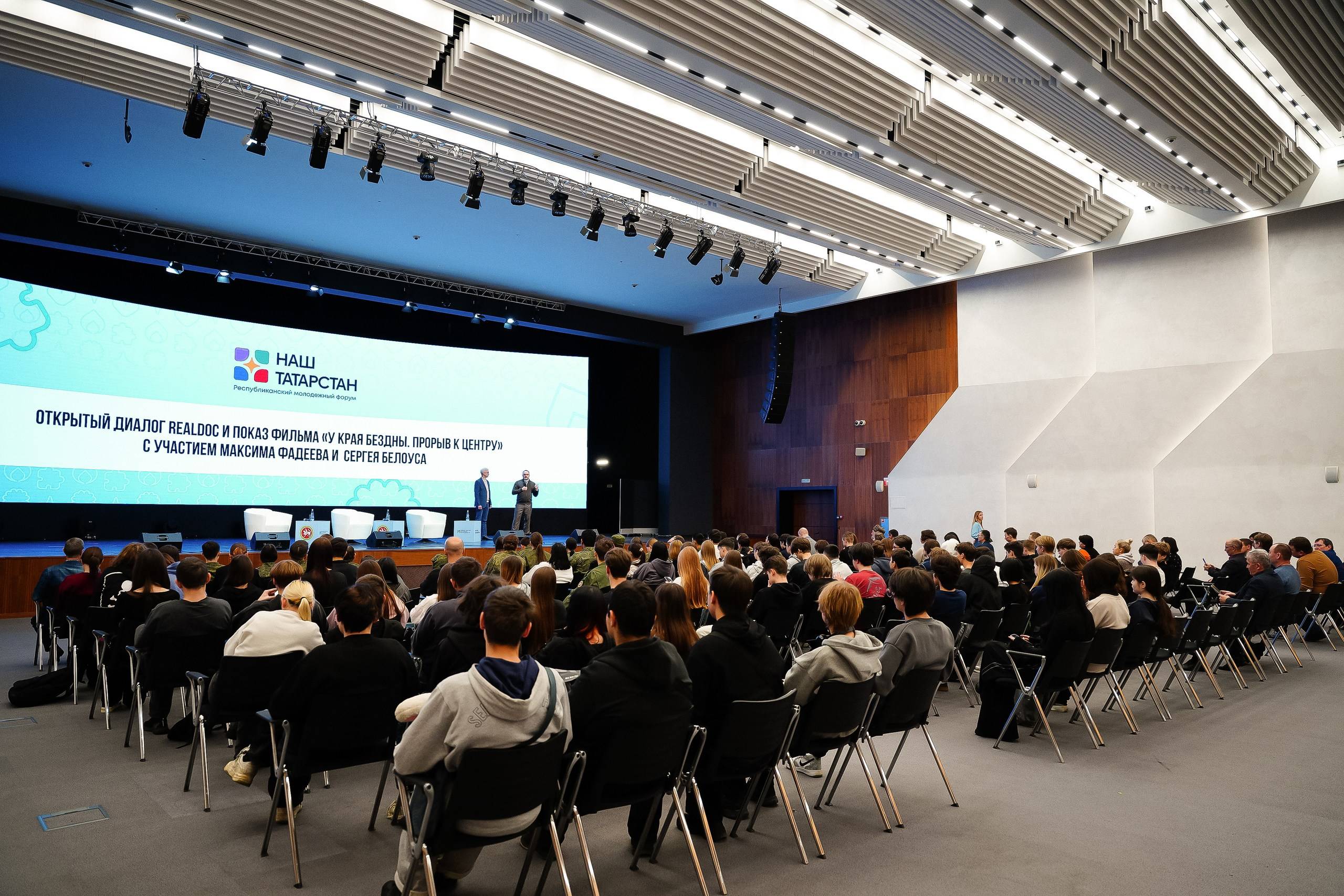 В первой половине дня студия реальной документалистики RealDoc представила в Казани фильм «У края бездны. Прорыв к центру» о бойцах батальона «Сомали» и штурме Мариуполя. После показа режиссёр и оператор фронтовой хроники Максим Фадеев и кинорежиссёр, оператор и продюсер Сергей Белоус провели открытый диалог с участниками форума. Обсуждались принципы работы военного корреспондента, этика «честного кадра», границы между документом и агитацией, ответственность автора за зафиксированные на экране события и людей. Молодёжь интересовали практические вопросы: как строится съёмка на передовой, как завоёвывается доверие героев и что будет с отснятой хроникой через 10–20 лет.