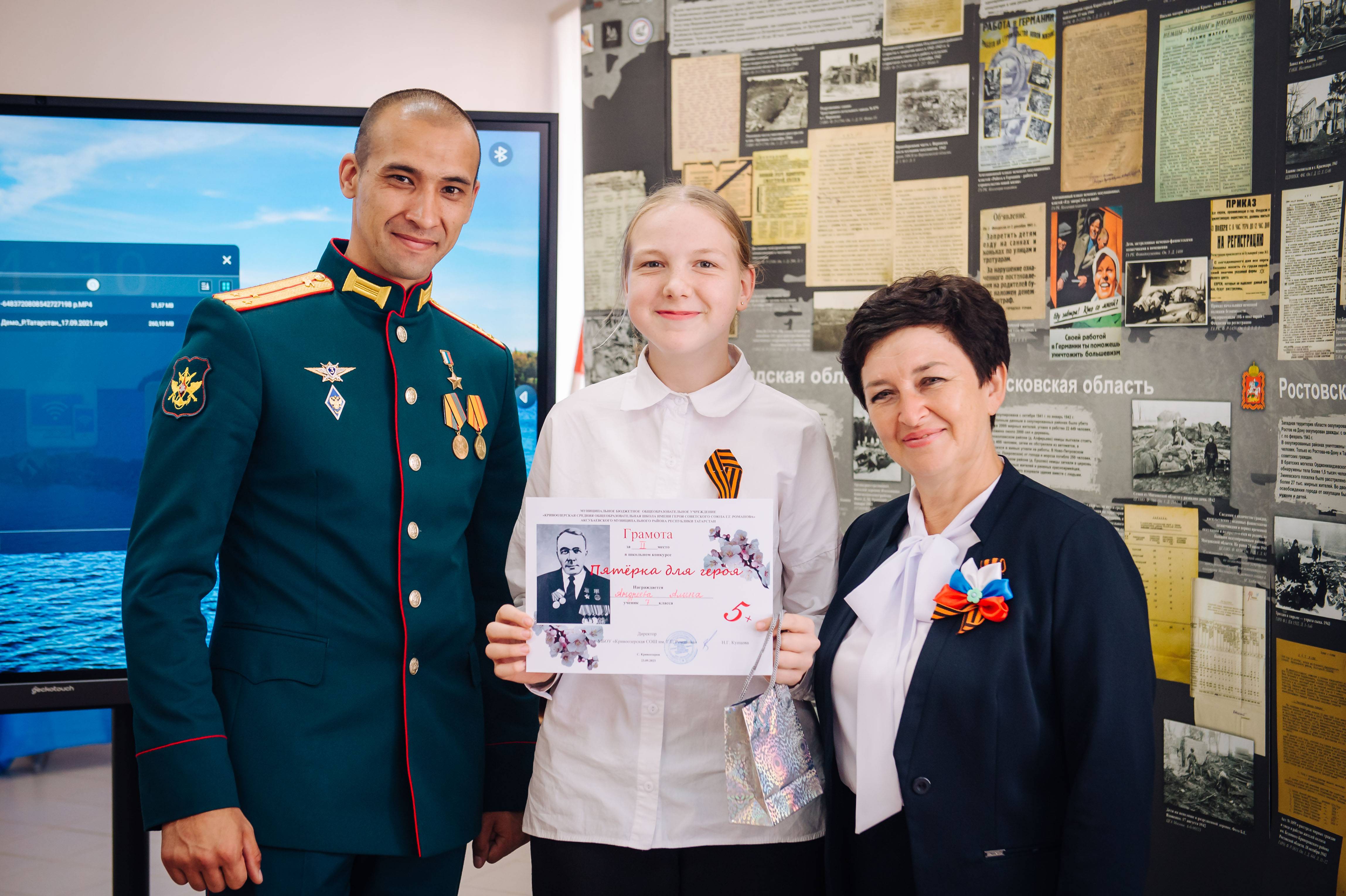 Так же во время встречи были подведены итоги школьного конкурса "Пятерка для Героя". Победителям, получившим за 4 учебных дня более 20-ти пятерок, грамоты и подарки вручил Герой России Расим Баксиков.