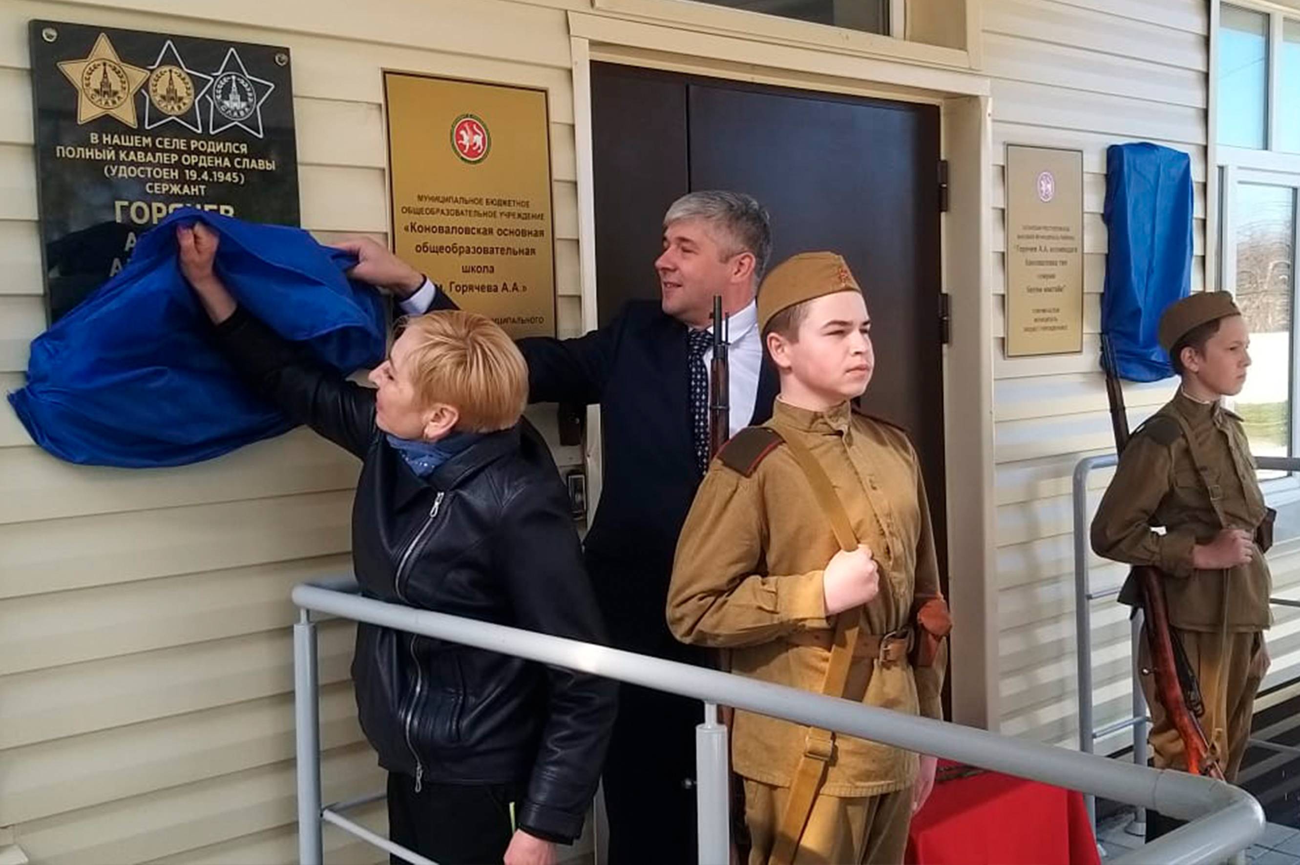 Мемориальная доска полному кавалеру ордена Горячеву Алексею Андреевичу открыта в селе Коноваловка Мензелинского района.