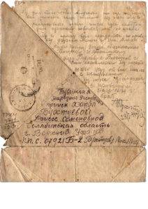 Ушел солдат, но вдали от дома грустит по родному очагу. Счастливая была минута, когда он получал теплое, родное письмо. Теперь — это особый первоисточник летописи Великой Отечественной войны — фронтовые письма, пожелтевшие от времени треугольники. Организация военно-полевой почты рассматривалось правительством СССР как дело государственной важности. «Каждое письмо, посылка…. вливают силы в бойцов, вдохновляют на новые подвиги», особо подчеркивалось в передовице газеты «Правда» в августе 1941 г. В самом начале войны в Главном управлении связи Красной Армии было сформировано Управление военно-полевой почты. В годы войны самое большое распространение (и известность) получили письма, складывавшиеся простым треугольником. Письмо треугольник — обычный тетрадный прямоугольный лист бумаги, сначала загнутый диагонально справа налево, потом слева на право. Оставшаяся полоса бумаги вставлялась, как клапан, внутрь треугольника. Готовое к отправке письмо не заклеивалось, его всё равно должна была прочитать цензура. Почтовая марка была не нужна, адрес писался на наружной стороне листа. Письма обязательно просматривались военной цензурой, чтобы не дать возможности врагу по содержанию личной переписки получить сведения о дислокации частей, их вооружении и т.д. Строчки с важной информацией, военными данными вымарывались чёрной краской. Ставился штамп: «Проверено военной цензурой» или «Просмотрено военной цензурой».