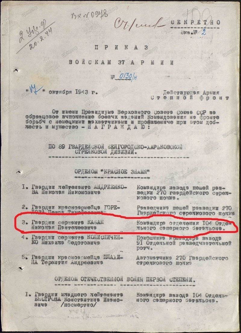 В конце июля 1943 года были ликвидированы на орловском плацдарме немецкие войска (2-я танковая и 9-я армии), которые два года содержали сильную эшелонированную оборону с развитой системой полевых укреплений и инженерных заграждений. 3 августа войска Воронежского и Степного фронтов перешли в наступление. Николай Пантелеевич Кабак был командиром отделения 104 отдельного саперного батальона 89-й гвардейской Белгородско-Харьковской Краснознаменной ордена Суворова стрелковой дивизии 37-й армии Степного фронта.