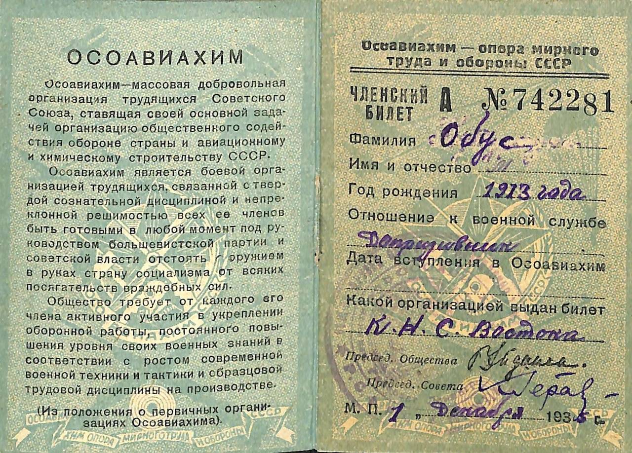 Среди документов имеется членский билет советской общественно-политической оборонной организации «ОСОАВИАХИМ».