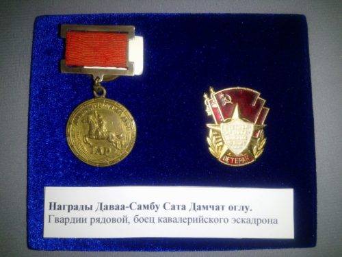 Награды Даваа-Самбу Сата Дамчат оглу – медаль ТНР 1944 г. Показал храбрость при освобождении города Ровно с первых же боев, затем Дубно. Сундуй Тюлюш своим личным примером уничтожал вражескую силу и огневые точки под д. Похорельце. Старшина воевал бок о бок с бесстрашным командиром Сатом Бурзекеем на линии Сурмичи – Дубно. В витрине экспонируется извещение о том, что Сундуй Тюлюш погиб смертью храбрых при освобождении Ровно, даже указано, где находится его могила. Однако гвардеец вернулся живым в июне 1944 г. с остальными добровольцами домой, что стало большой радостью для его родителей и близких. Награжден орденами Славы III степени и Отечественной войны II степени и Труда ТНР.