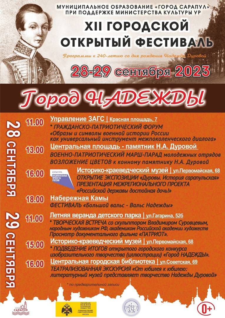 В Сарапуле с 28 по 29 сентября пройдет XII открытый городской фестиваль «Город НАДЕЖДЫ». В этом году главное патриотическое событие осени посвящено 240-летию со дня рождения Почетного гражданина Сарапула, Георгиевского кавалера, первой в России женщины-офицера Надежды Дуровой.