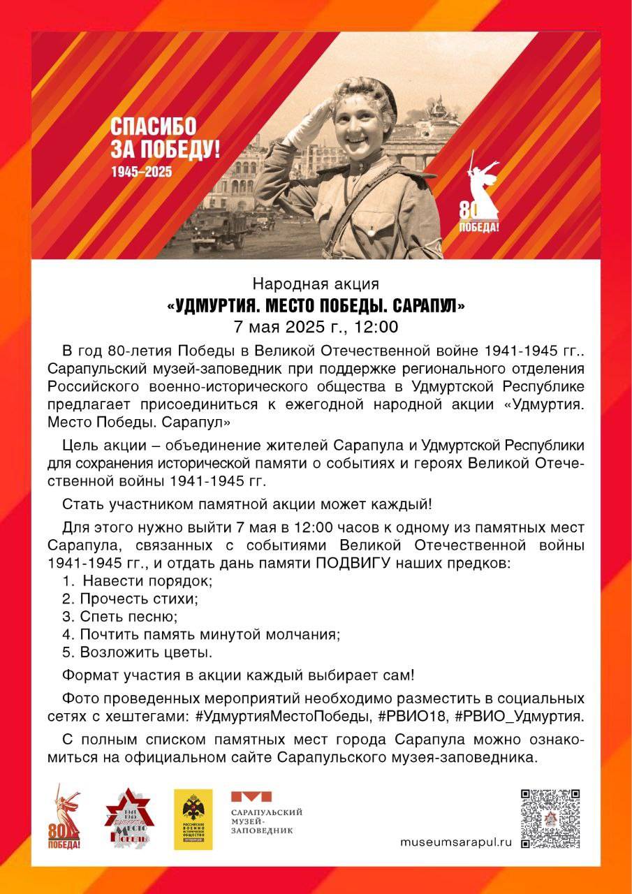 В рамках Года защитника Отечества и 80-й годовщины Победы в Великой Отечественной войне 1941 — 1945 гг., при поддержке Регионального отделения Российского военно-исторического общества в Удмуртской Республике, в городе Сарапуле традиционно пройдет народная акция «Удмуртия. Место Победы. Сарапул».