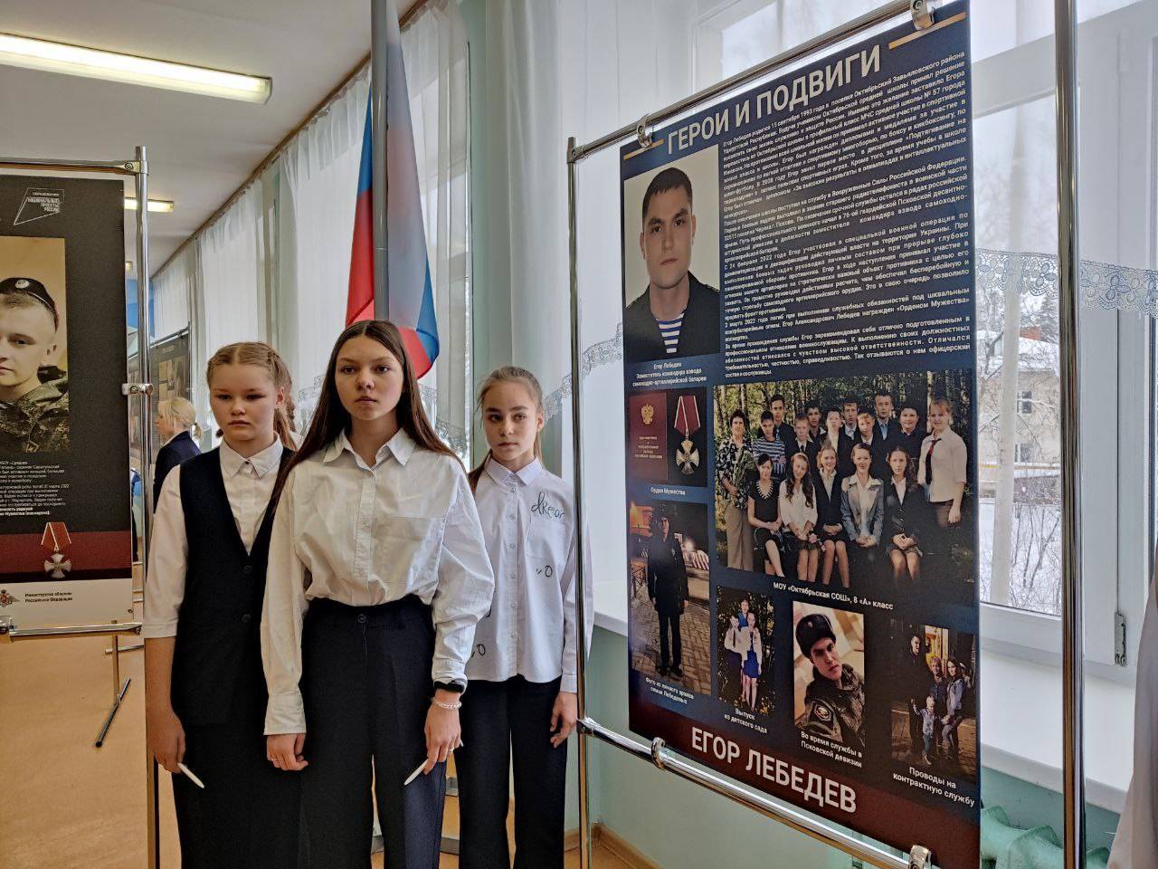 Один из стендов этой выставки посвящен Егору Лебедеву - тут его школьные фотографии, семейные, биография, рассказ о подвиге.