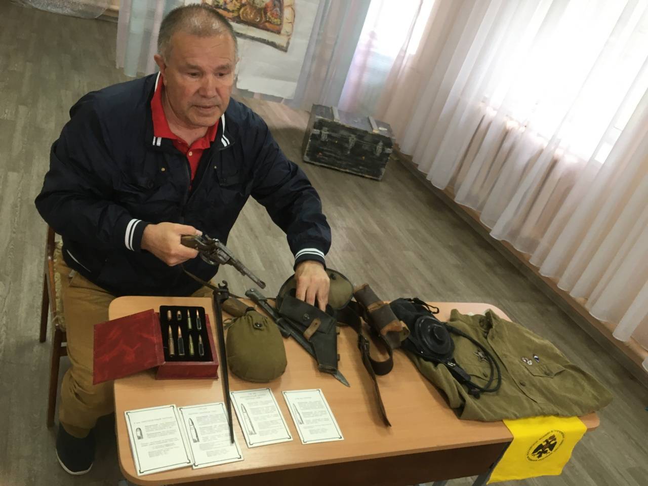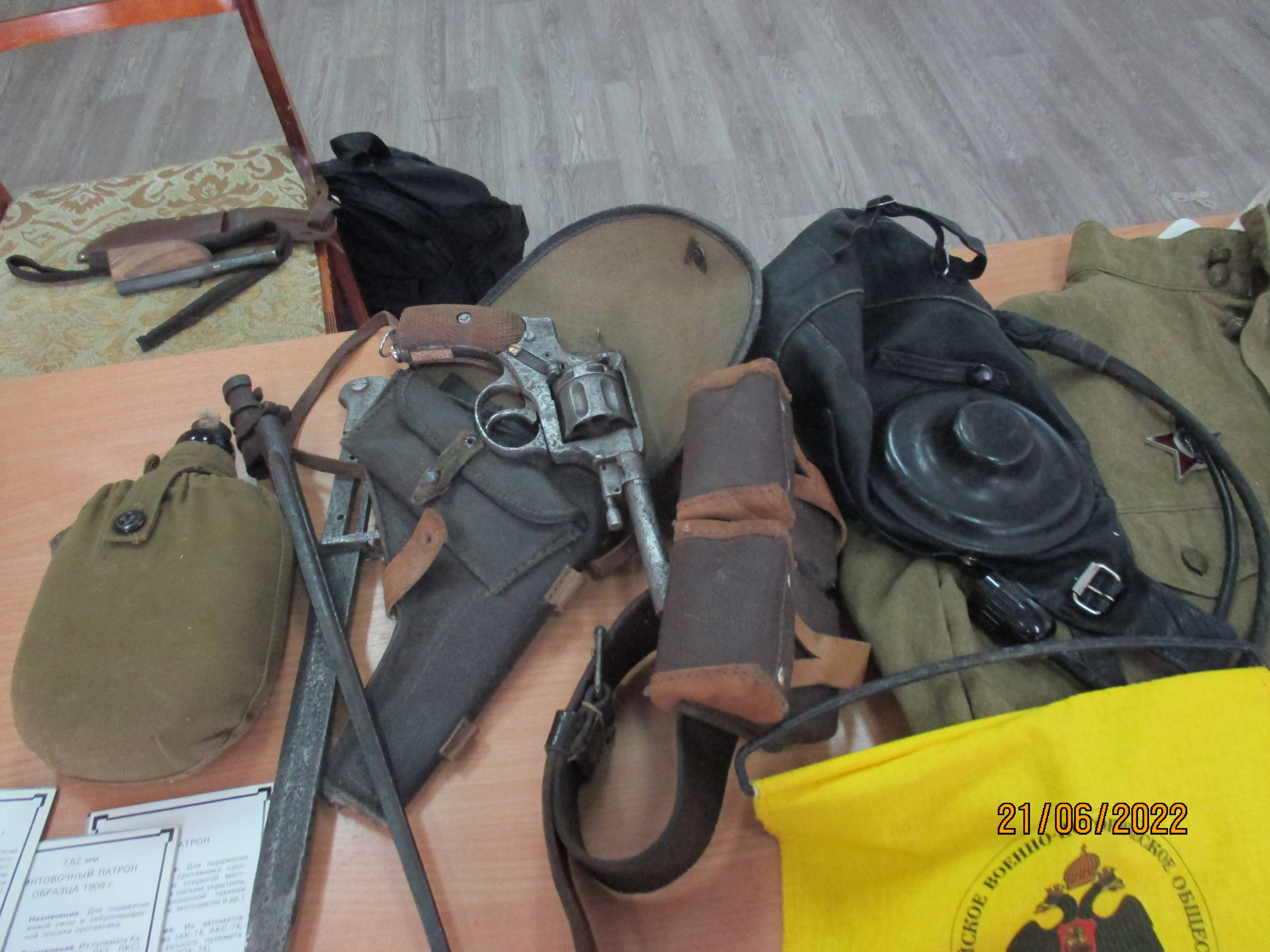 Предметный ряд небольшой выставки продемонстрировал макеты оружия, знаки, муляжей боеприпасов и различных предметов того времени.