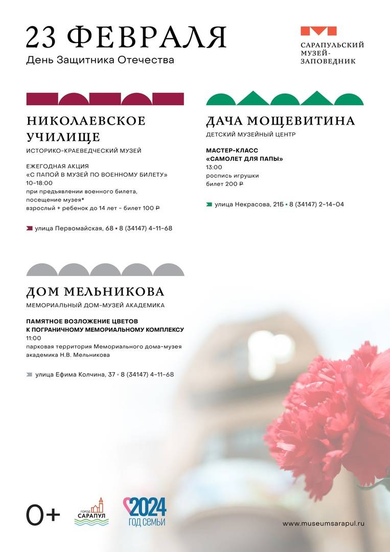 По доброй традиции в честь праздника 23 февраля в Историко-краеведческом музее (г. Сарапул, ул. Первомайская, 68) пройдет акция «С папой в музей по военному билету». Только в этот день обладатели военного билета вместе со своим ребенком в возрасте до 14 лет смогут познакомиться с экспозицией и выставками музея по льготной стоимости. Билет на двоих составит всего 100 рублей. Акция состоится с 10:00 до 18:00 часов.