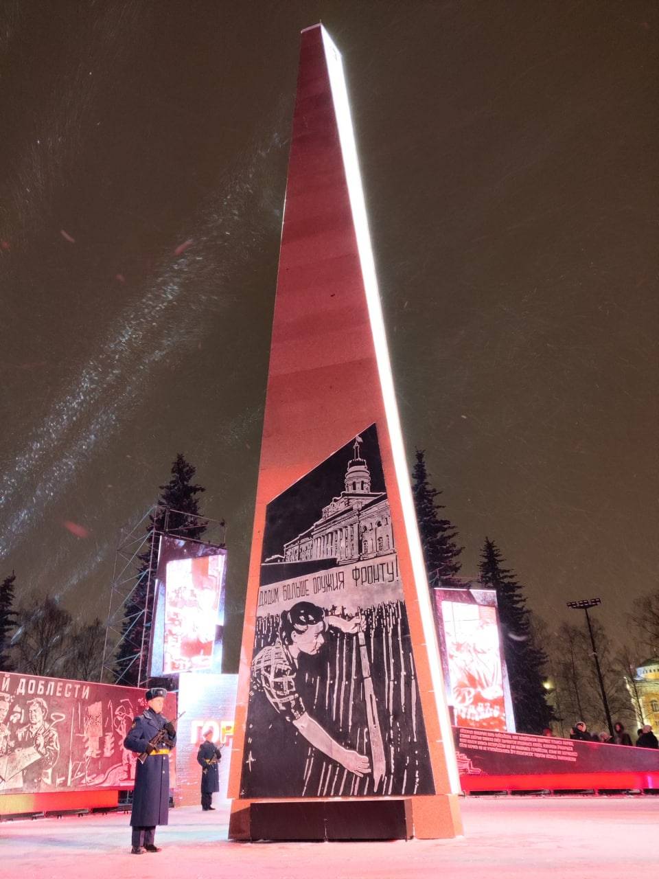 На 17-метровой стеле размещен Герб Ижевска и текст Указа Президента России о присвоении столице Удмуртии почетного звания. Три пилона с металлическими барельефами отражают трудовой подвиг жителей Ижевска в годы Великой Отечественной войны. Героями экспозиции стали оружейники, металлурги, врачи и медсестры, работавшие в госпиталях.