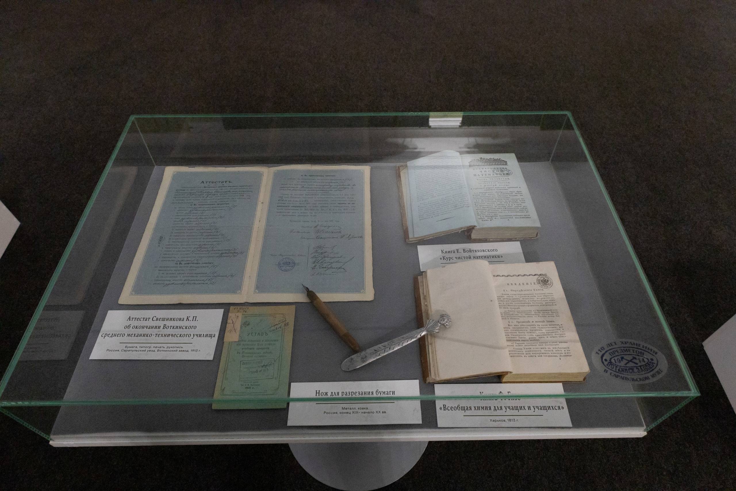 Еще на один экспонат хочется обратить ваше внимание – это аттестат Константина Свешникова об окончании Воткинского среднего механико-технического училища в 1913 году, который в 1921 году принимал участие в конструировании деталей опытного триплана «КОМТА».