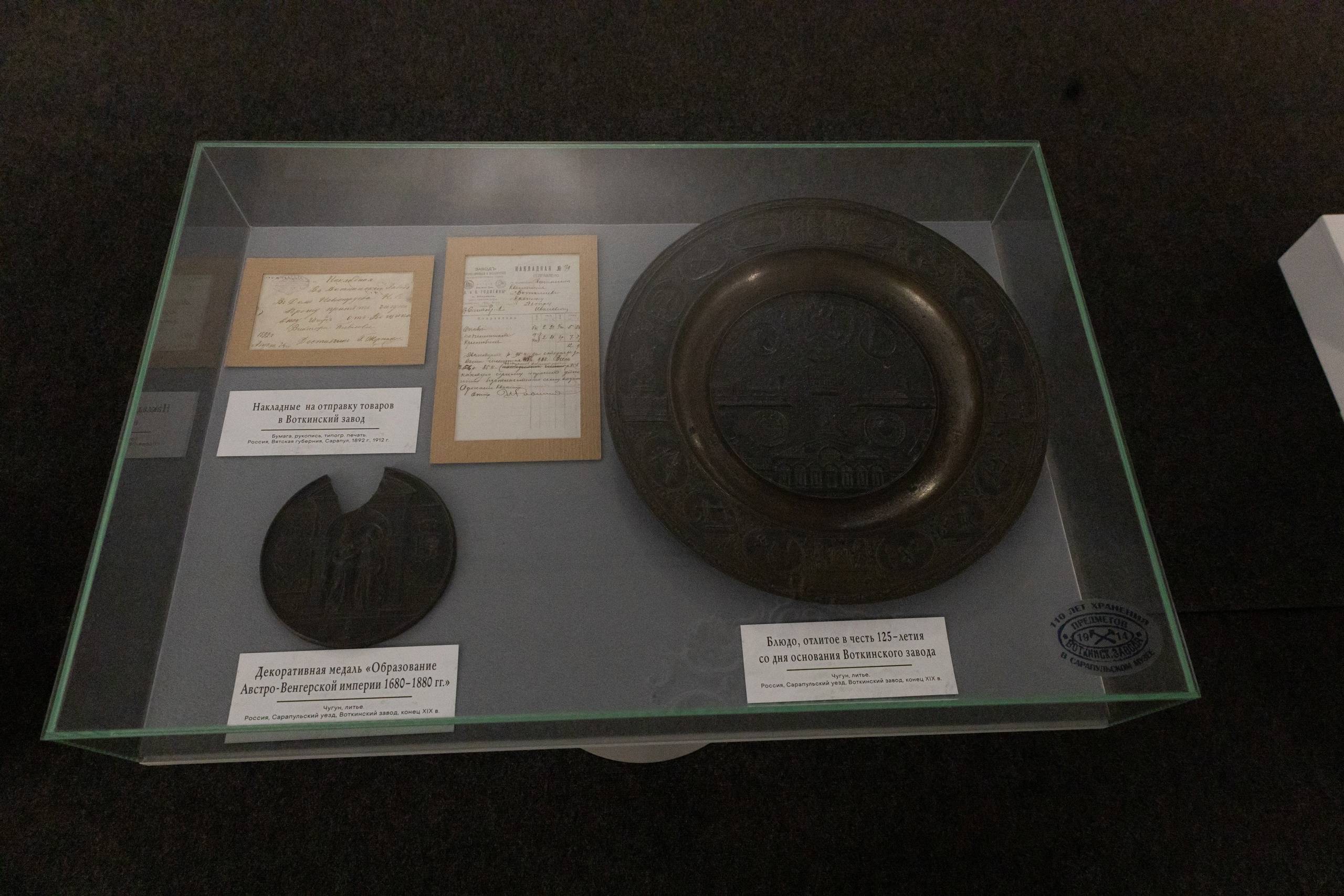 Особый интерес представляет чугунное блюдо с изображением паровоза и парохода, отлитое в честь 125-й годовщины со дня основания завода. Помимо этого, для строительства Камского моста использовали конструкции пролетных строений, которые были изготовлены в Воткинском заводе.