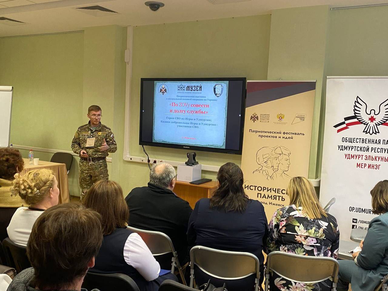 Напомним, патриотический фестиваль идей и проектов «Историческая память» организован при поддержке Российского военно-исторического общества, Министерства просвещения Российской Федерации и депутата Государственной Думы ФС РФ, председателя регионального отделения РВИО в Удмуртской Республике Л.Н.Бурановой. Мероприятия в рамках фестиваля проходят в Ижевске с 28 по 30 октября.