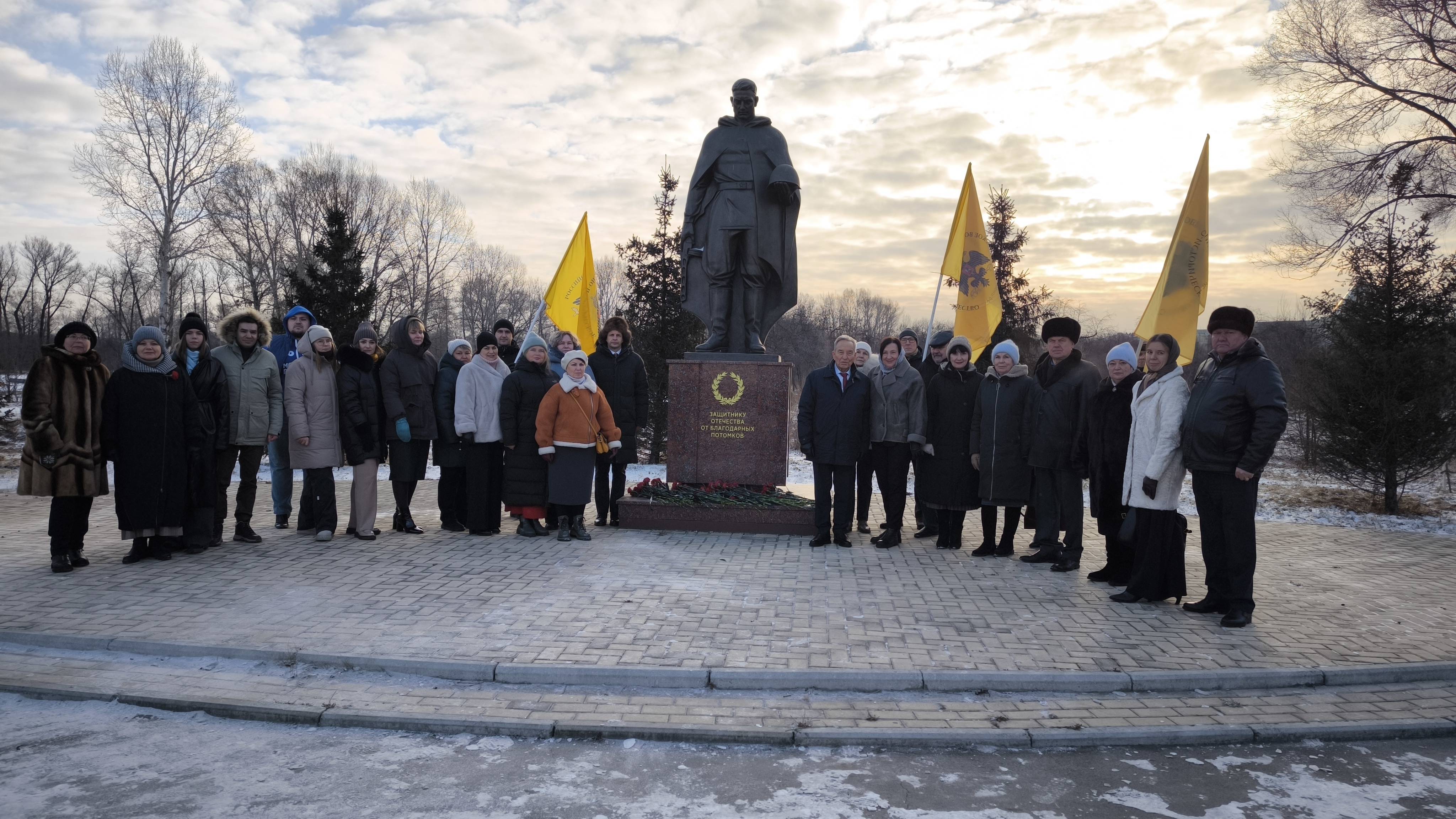 Сегодня члены Хакасского регионального отделения РВИО возложили цветы к подножию Монумента Советскому солдату в Георгиевском саду Абакана.