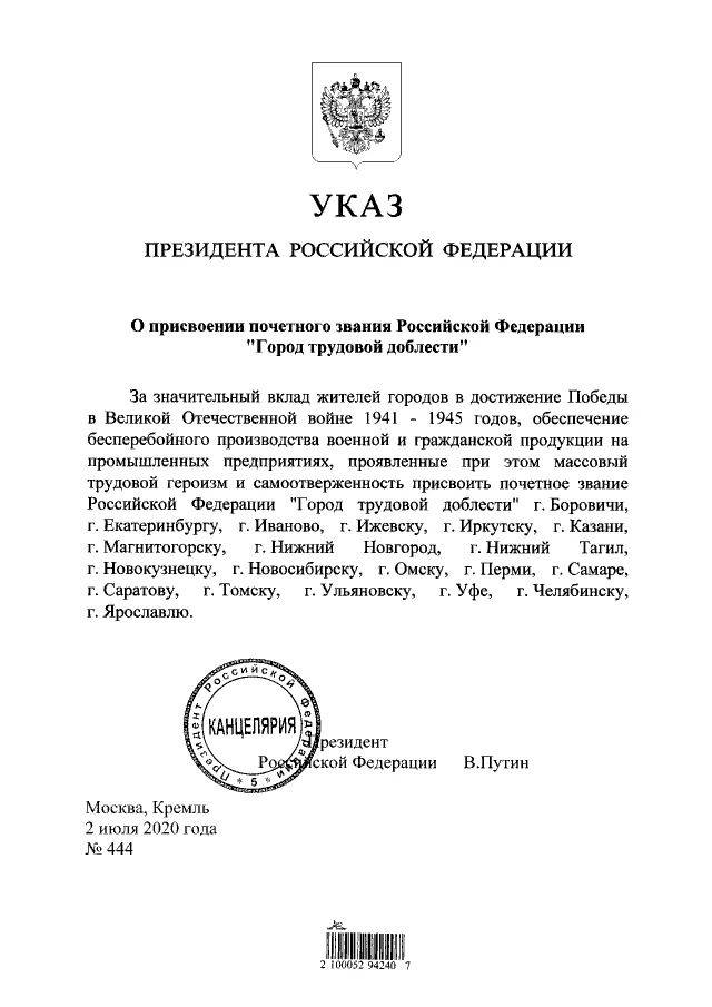 Уфа получила почётное звание «Город трудовой доблести» 2 июля 2020 года благодаря указу Президента Российской Федерации.