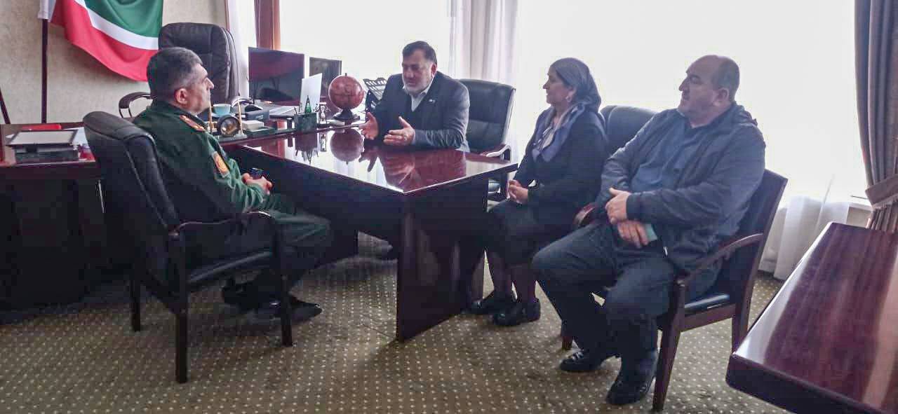 В военном комиссариате Чеченской Республики, члены Общественной палаты ЧР, Жарадат Бугаева, Абдулхамид Уздорбиев, а также заместитель председателя регионального отделения "Российского военно - исторического общества " в Чеченской Республике Муслим Мурдалов, в рабочей обстановке встретились с главой ведомства, полковником Нумахаджиевым Русланом Мухасовичем.