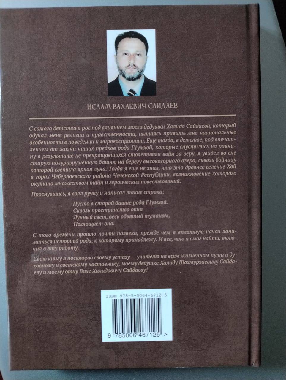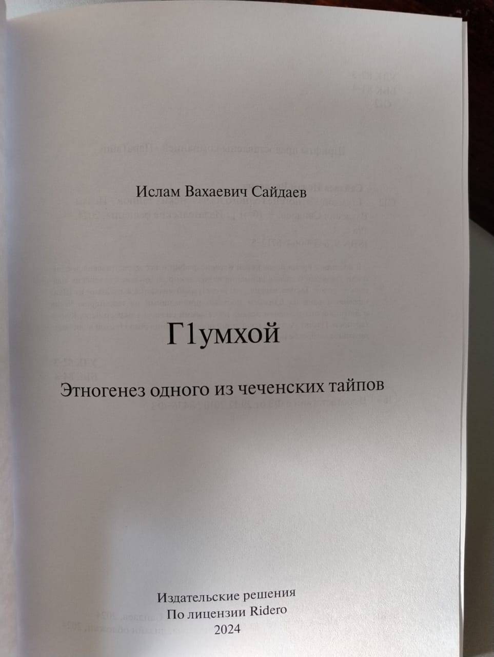 Вышла в свет новая книга известного чеченского журналиста, политолога, публициста, заместителя Председателя Регионального отделения ООГО “Российское военно-историческое общество” в Чеченской Республике, помощника председателя Общественной палаты Чеченской Республики, руководителя Чеченского отделения Межрегионального общественного движения в поддержку возрождения и сохранения исторических традиций “Наследие Империи” Сайдаева Ислама Вахаевича - “Г1УМХОЙ” (этногенез одного из чеченских тайпов).