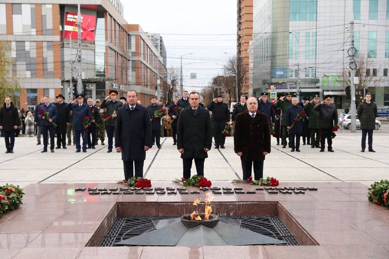 В Краснодаре на площади Памяти Героев состоялась традиционная торжественная церемония возложения цветов и гирлянд к мемориалу «Вечный огонь», организованная администрацией Краснодарского края. На церемонии возложения присутствовал губернатор Краснодарского края Вениамин Кондратьев и другие официальные лица.