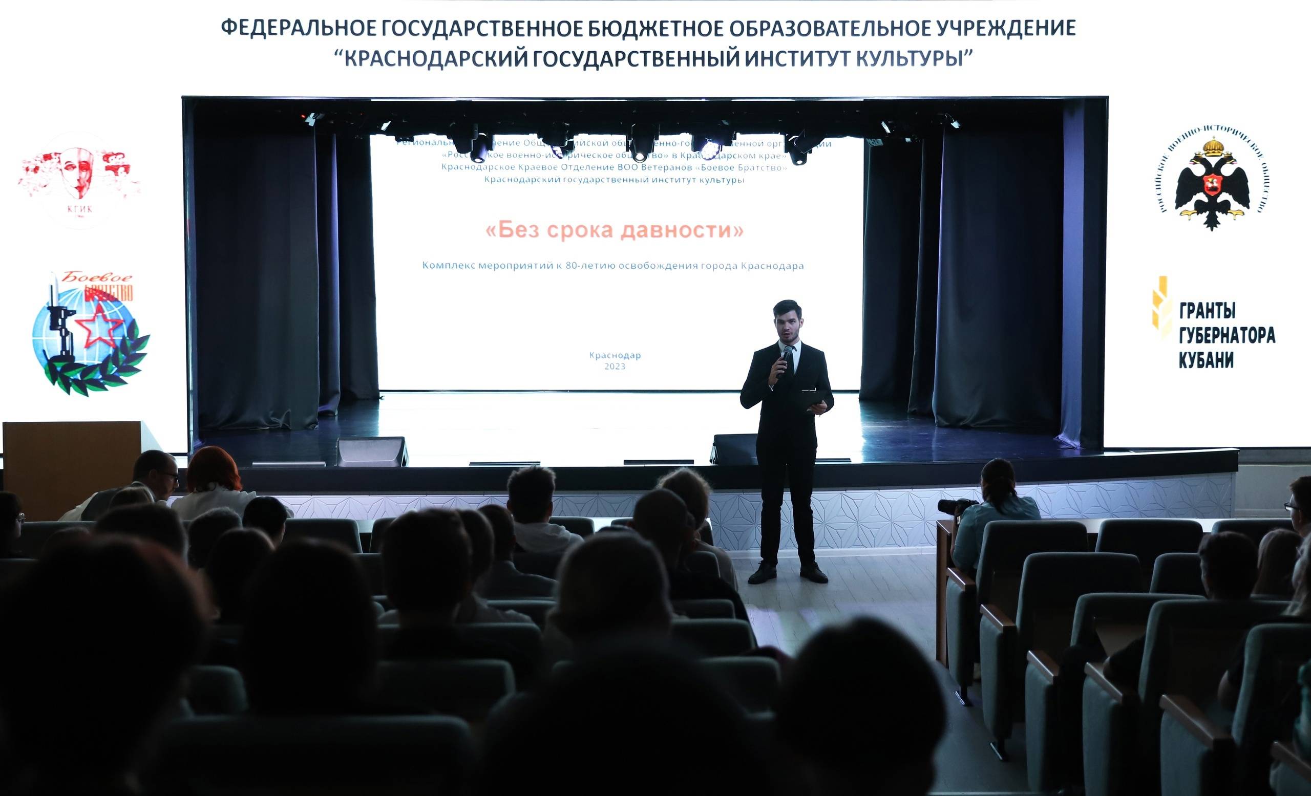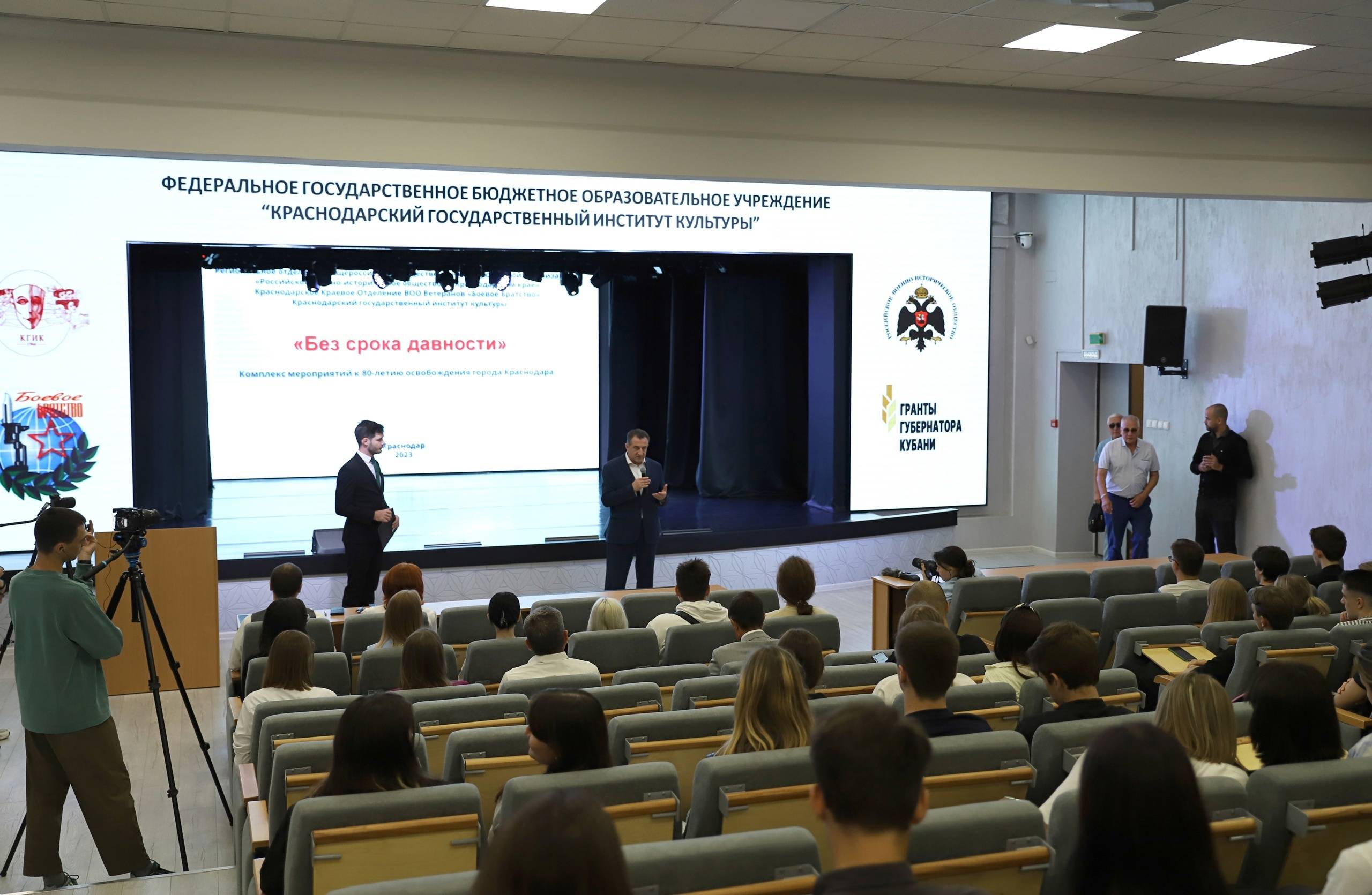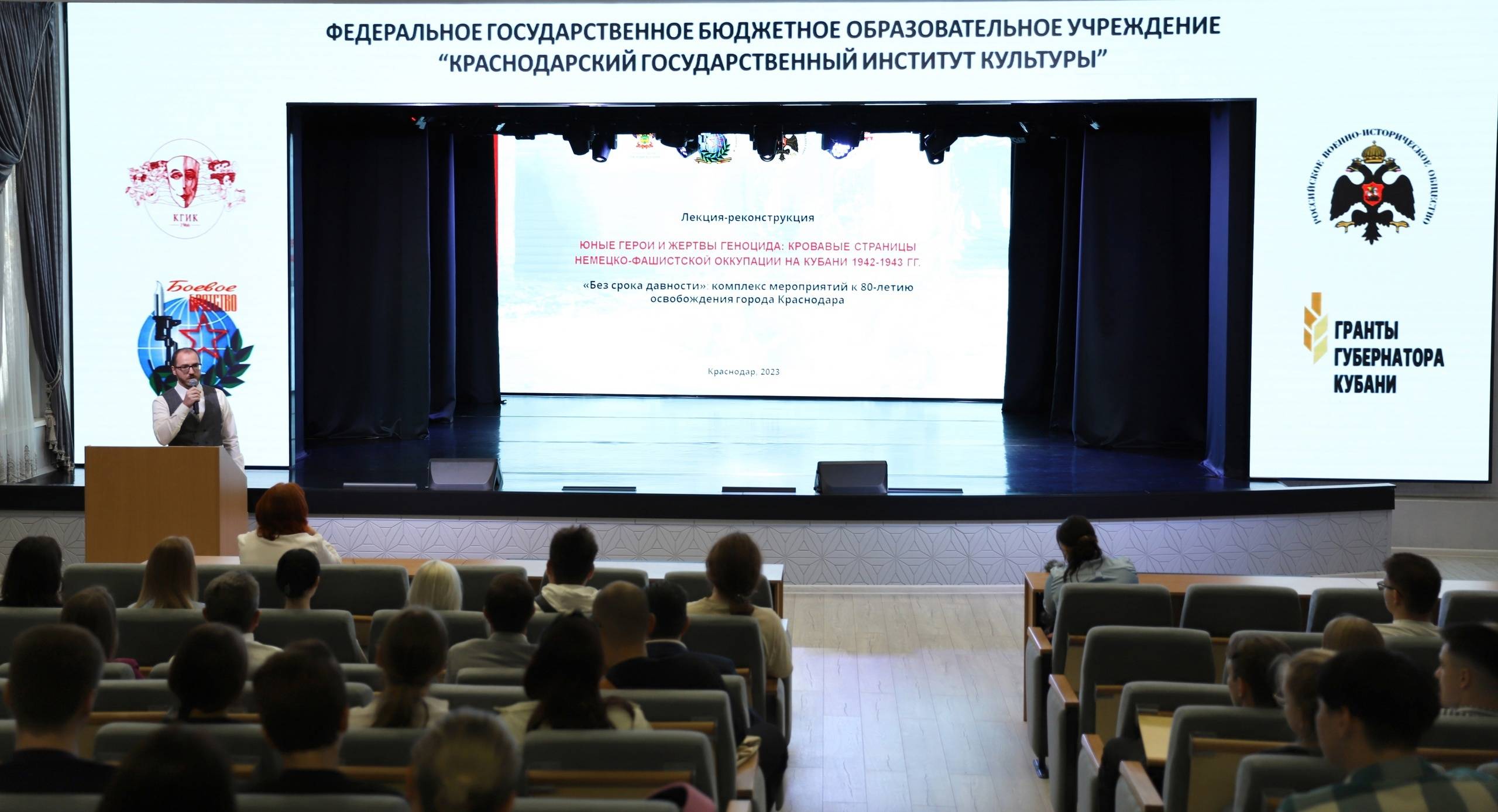 В Краснодарском государственном институте культуры при поддержке КРО РВИО прошла лекция-реконструкция «Юные герои и жертвы геноцида: кровавые страницы немецко-фашистской оккупации на Кубани 1942 – 1943 годов». Мероприятие состоялось в рамках крупнейшего научно-просветительского проекта «Без срока давности».