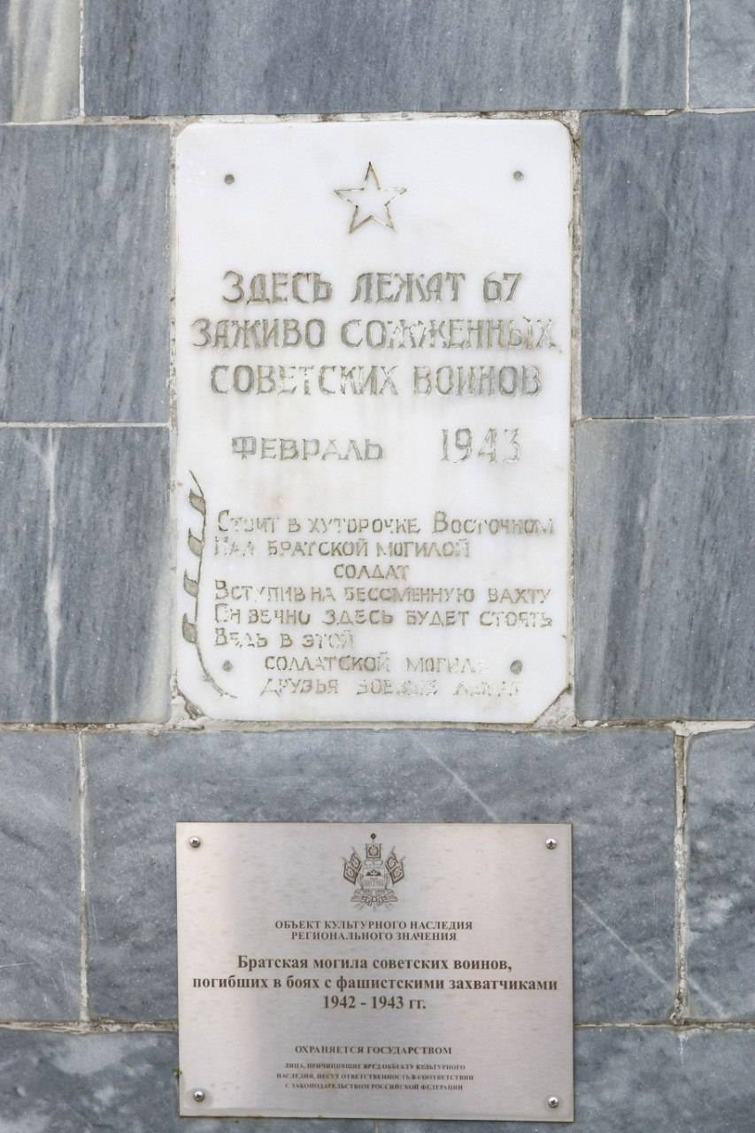 Монумент в хуторе Восточный был восстановлен восемь лет назад по инициативе председателя КРО РВИО Сергея Зенгина. С того времени студенты вуза и волонтерские отряды регулярно посещают памятник и следят за его состоянием. Сейчас любой желающий может приехать и почтить память 67 советских солдат, заживо сожженных в годы Великой Отечественной войны.