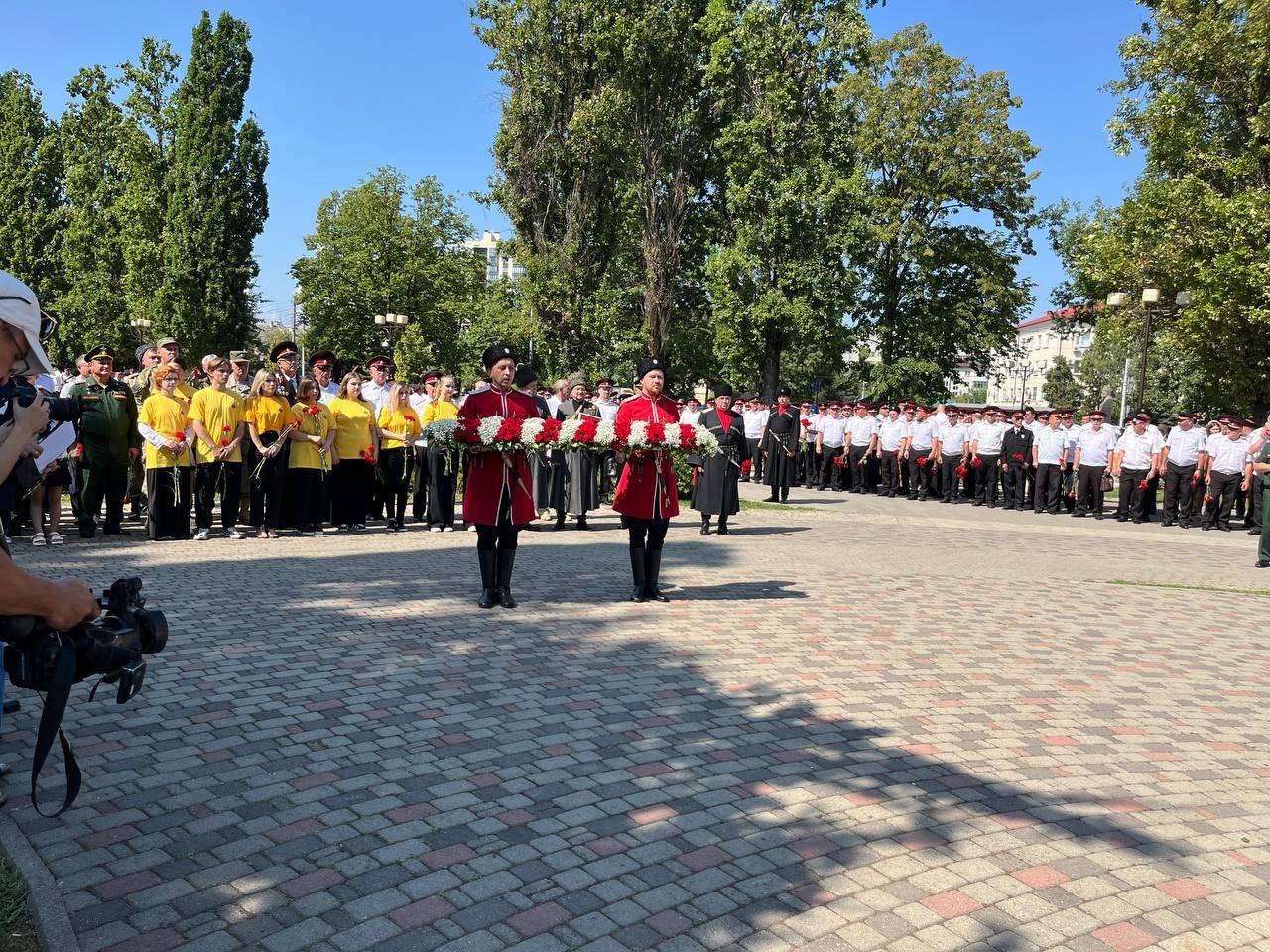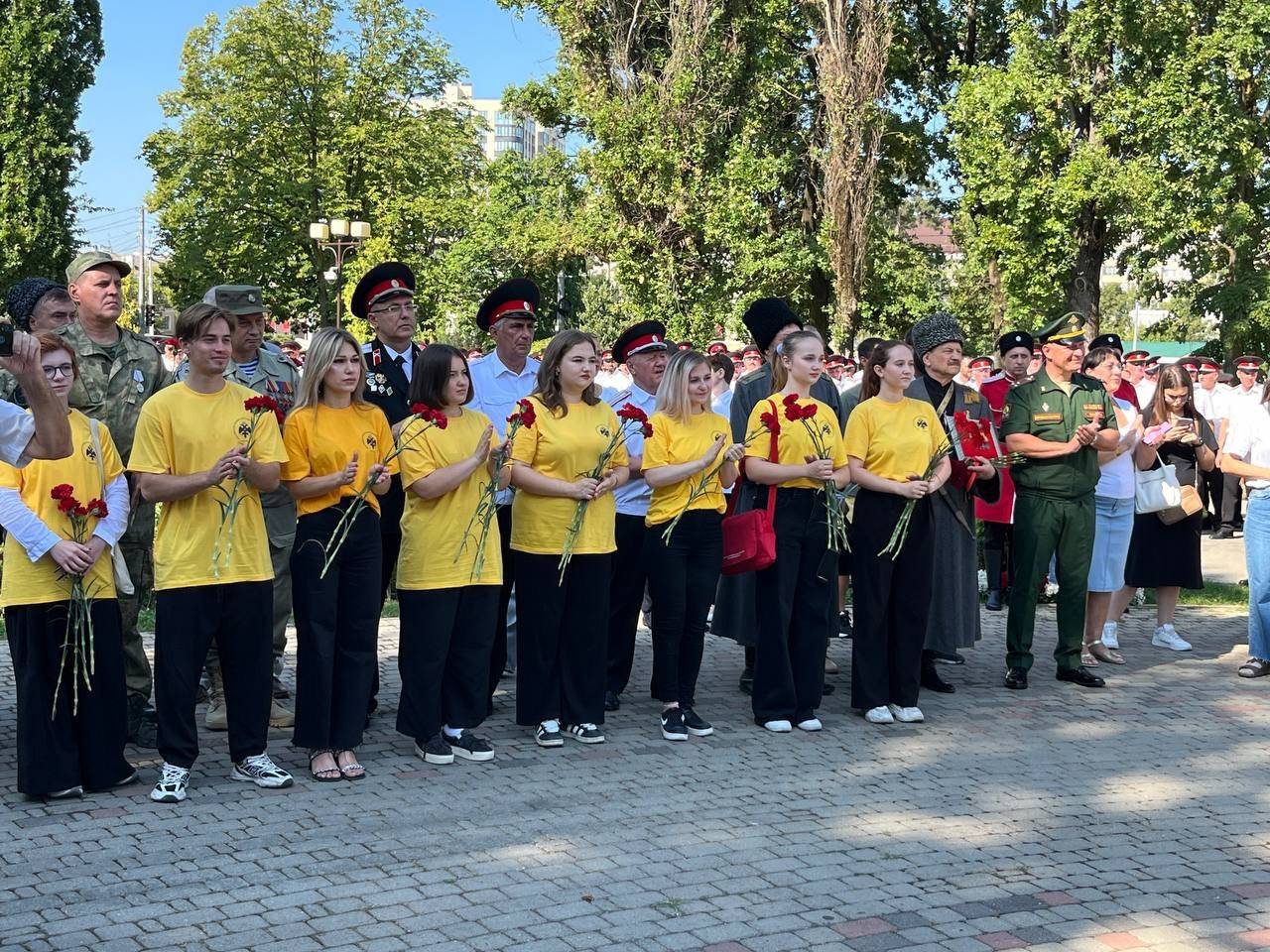 300 казаков ровным строем открыли торжественное мероприятие под предводительством заместителя Губернатора Краснодарского края, атамана Кубанского казачьего войска, казачьего генерала Александра Ивановича Власова. Из казаков и горцев в начале войны было сформировано особое боевое подразделение - Кавказская конная туземная дивизия. Ее солдаты и офицеры прославились своим героизмом на полях сражений. Свыше 30 тысяч из них были награждены различными орденами и медалями, в том числе четыре тысячи человек - георгиевскими крестами, одной из самых высоких наград в Российской империи.
