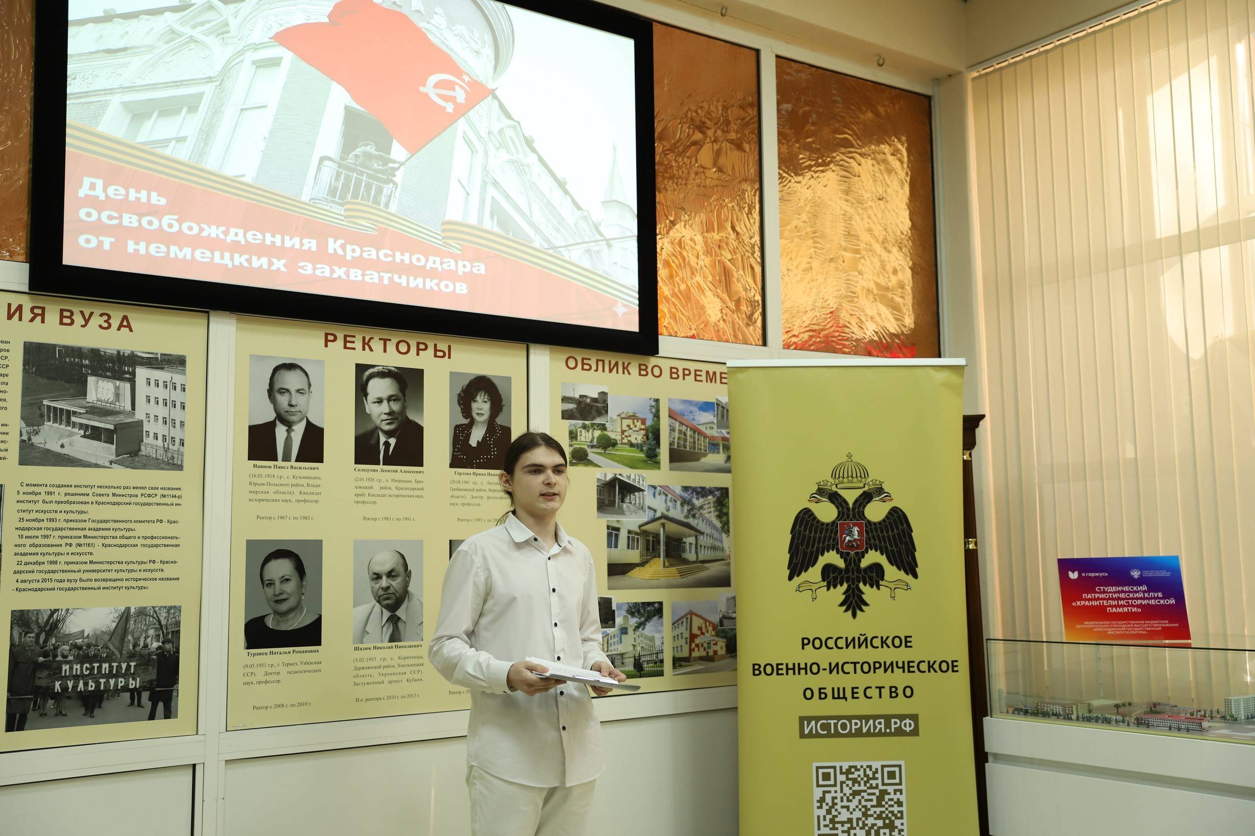 А в музее «Девяти муз» КГИК был проведен музейный урок и викторина «Страницы истории» для учащихся Музыкального кадетского корпуса имени Александра Невского. В рамках урока кадеты узнали об оккупации города Краснодара и о политике террора, которую проводили немецко-фашистские власти. Юношам рассказали о героизме подпольщиков, в том числе о детях-героях, которые совместно с бойцами Красной армии защищали город Краснодар.