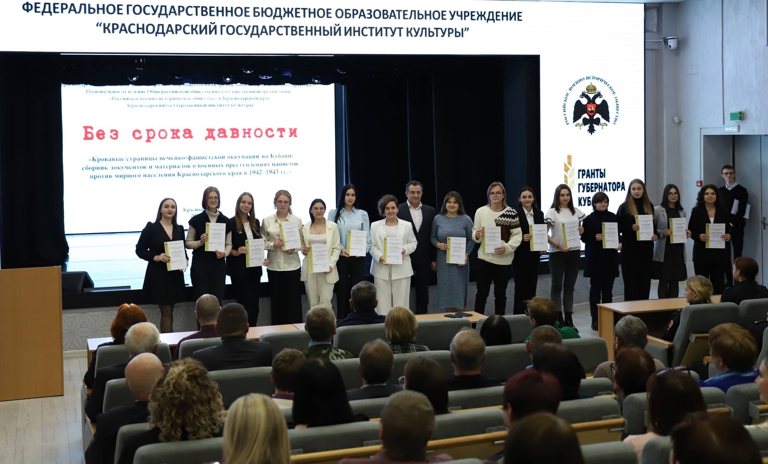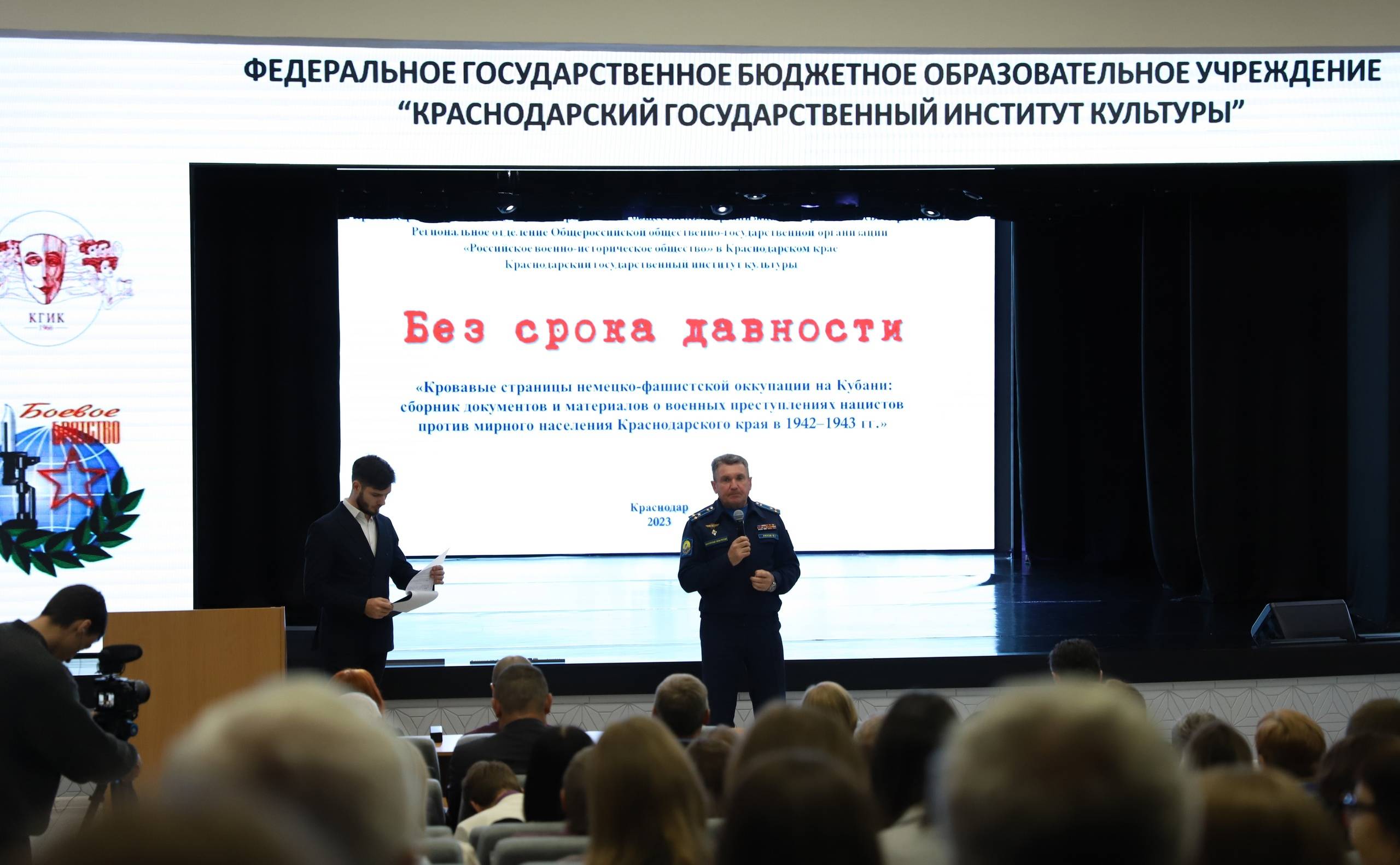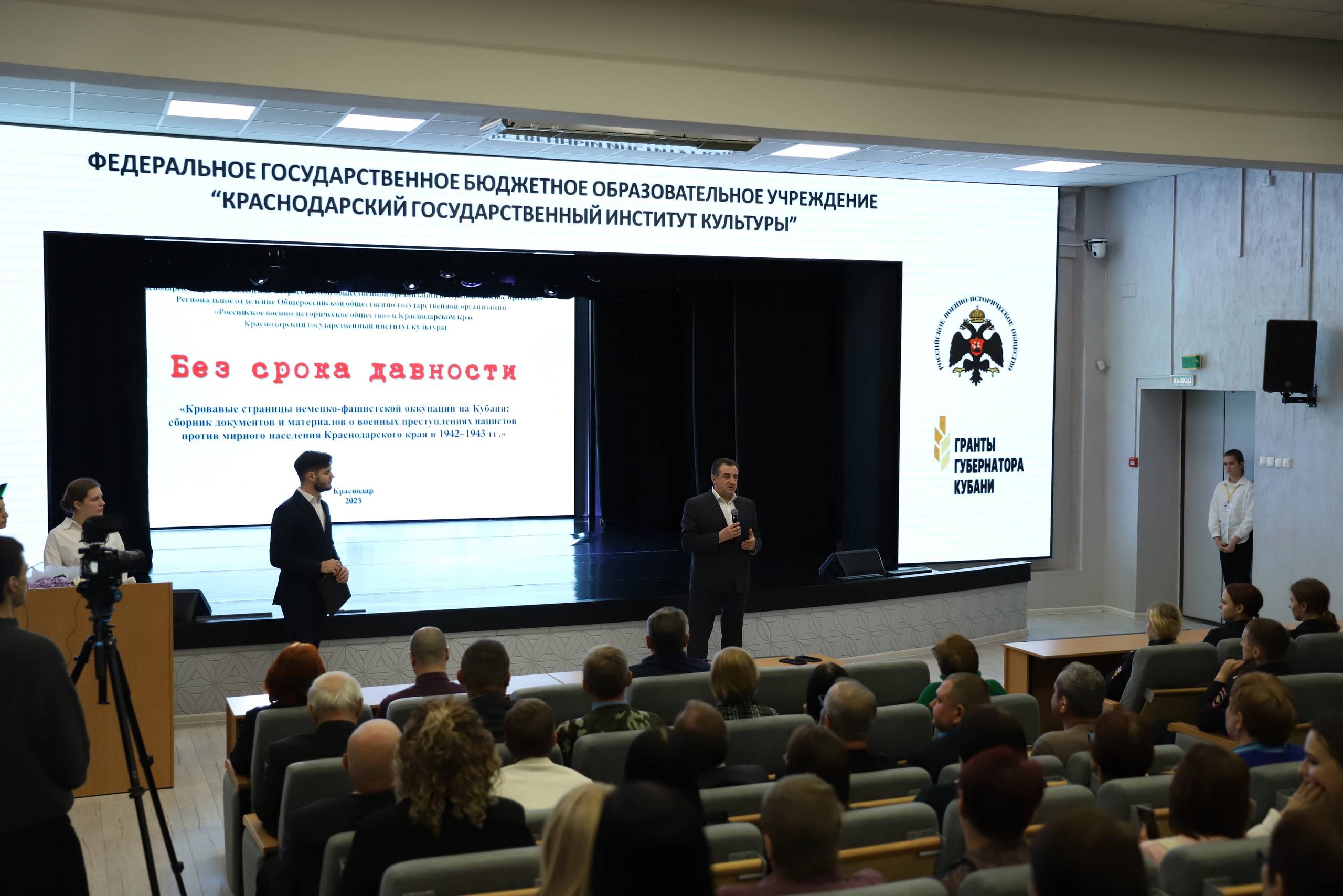 Общественно значимый проект «Без срока давности» реализуется Краснодарским региональным отделением Российского военно-исторического общества совместно с Краснодарским краевым отделением Всероссийской общественной организации ветеранов «Боевое братство» на средства гранта в рамках конкурса «Гранты губернатора Кубани». Сегодня, 23 ноября, в зале института культуры собрались не только студенты КГИК, но и представители 17 региональных отделений РВИО из Краснодарского края, а также курсанты Краснодарского университета МВД России. Для них прошла презентация третьего тома книги-сборника «Кровавые страницы немецко-фашистской оккупации на Кубани: сборник документов и материалов о военных преступлениях нацистов против мирного населения Краснодарского края в 1942–1943 гг.».