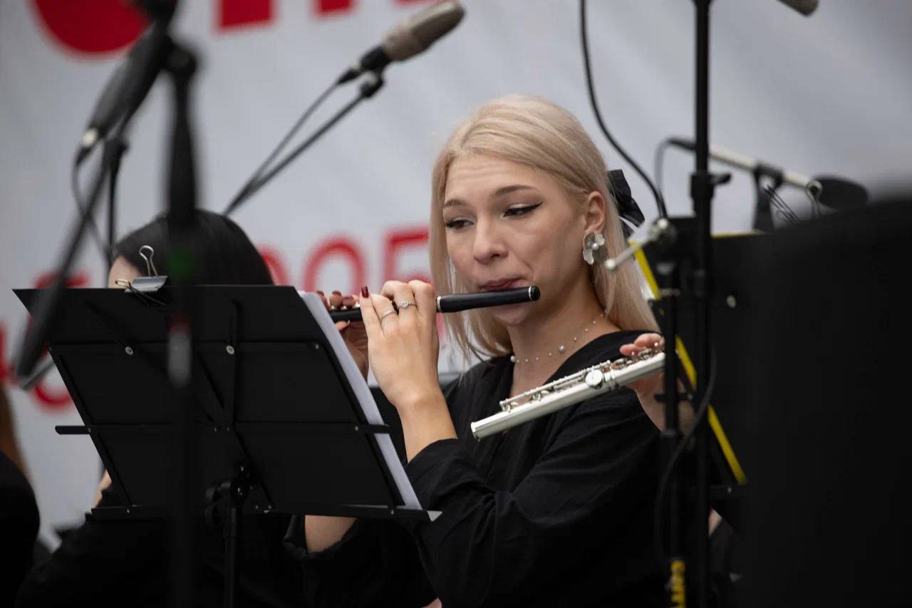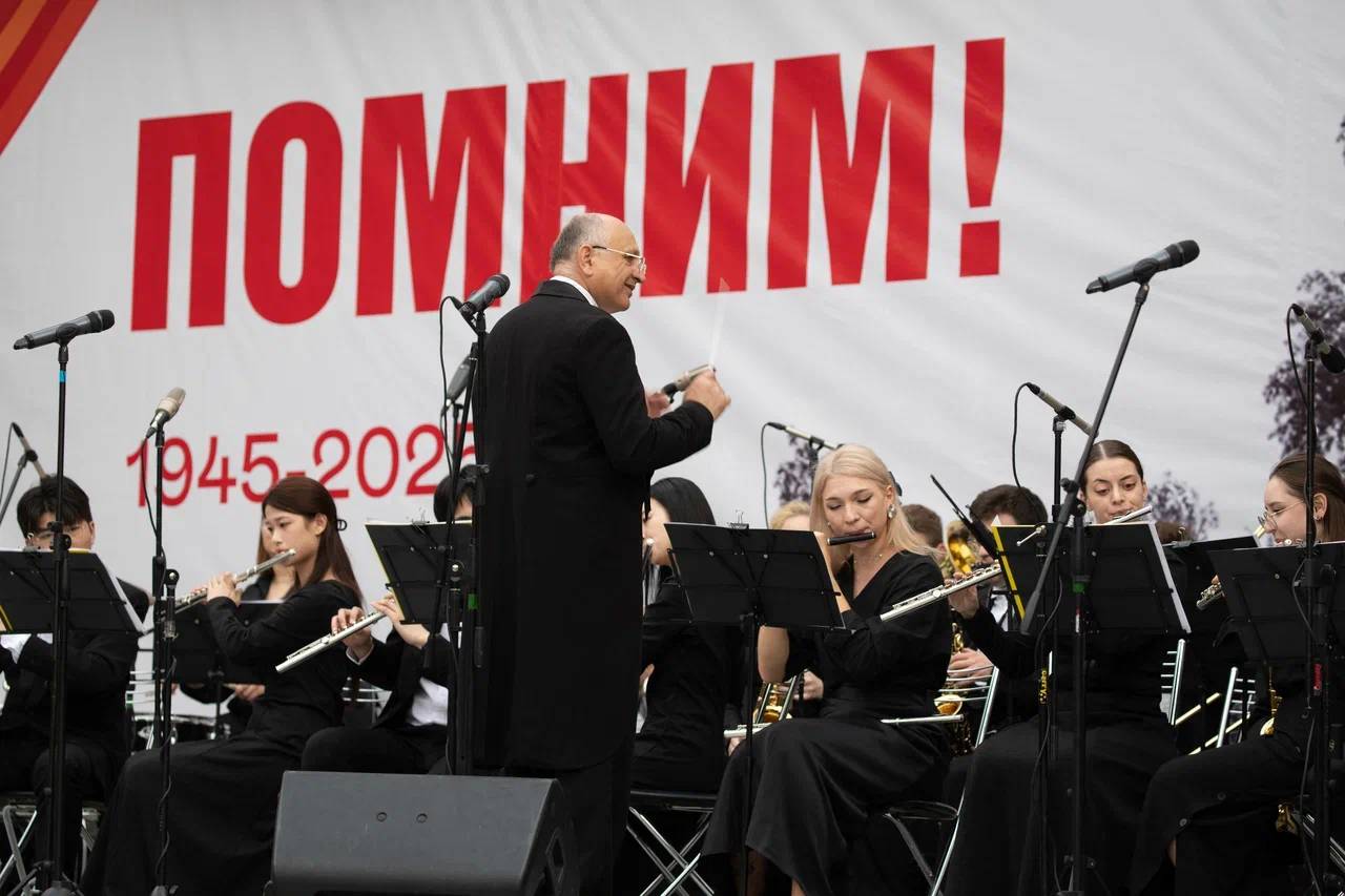 В концерте были исполнены произведения военных лет: «Темная ночь», «Смуглянка», «Катюша» и другие произведения, знакомые с детства, по-новому прозвучали в исполнении духового оркестра.