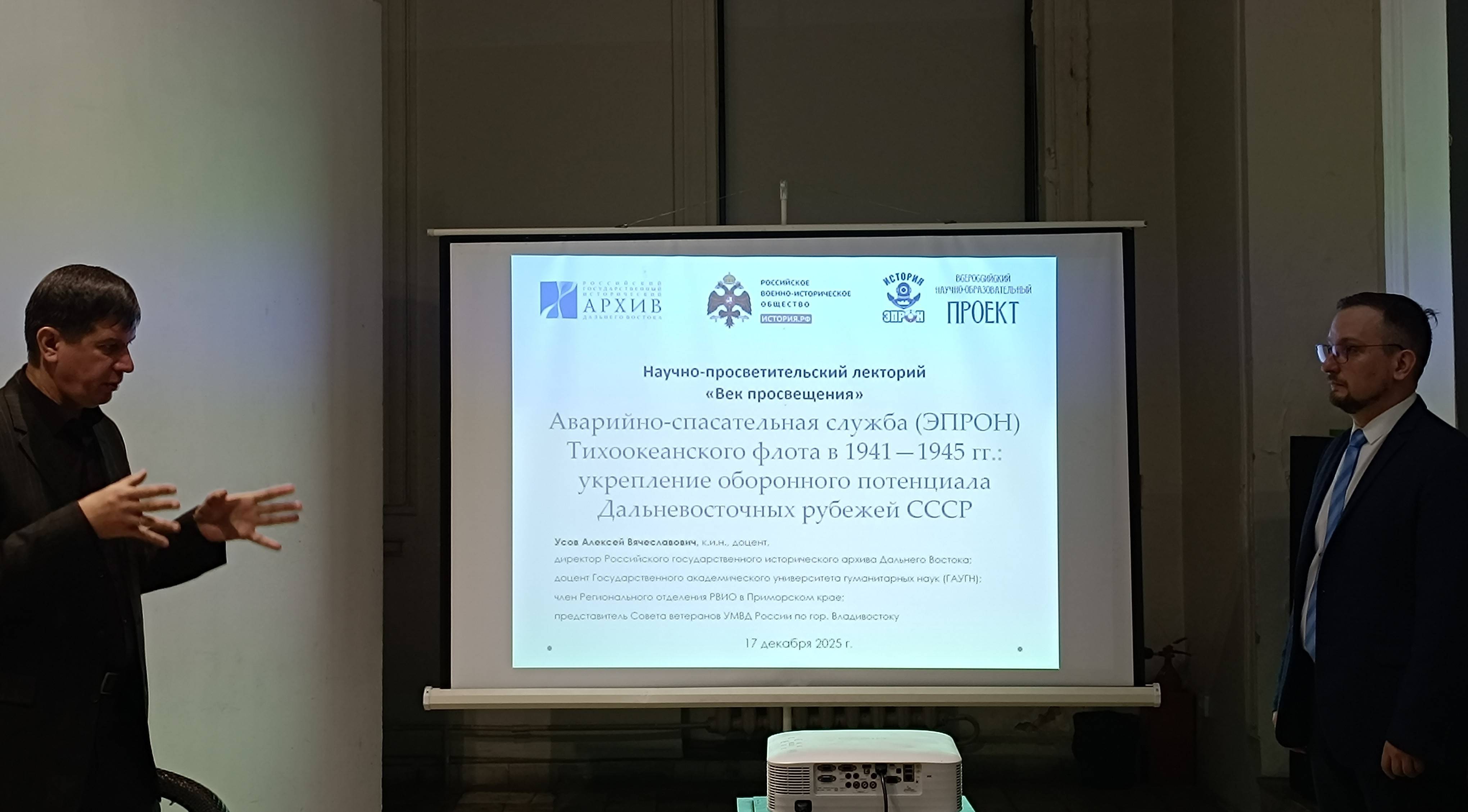 Проект был открыт лекцией директора Российского государственного исторического архива Дальнего Востока, кандидата исторических наук, доцента Алексея Вячеславовича Усова "Аварийно-спасательная служба (ЭПРОН) Тихоокеанского флота в 1941-1945 гг.: укрепление оборонного потенциала дальневосточных рубежей СССР".