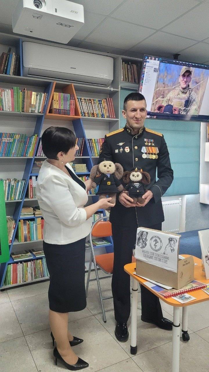 Жалыбина Г.М. рассказала учащимся, как Чебурашка стал талисманом для многих бойцов СВО, и передала Герою игрушку, связанную руками жительниц с. Сергиевского.