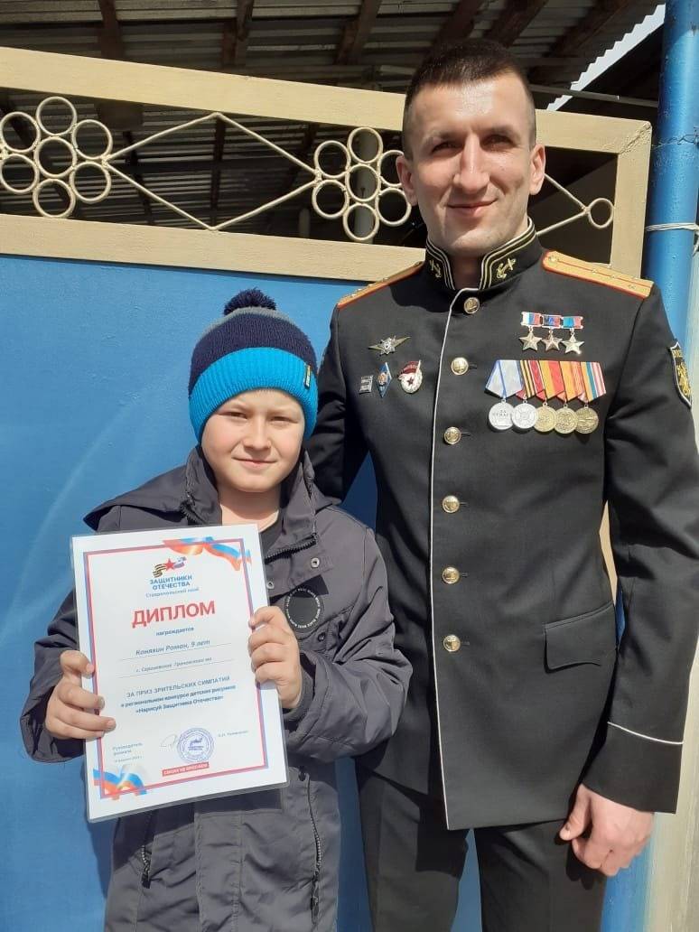 1 апреля 2024 года состоялось награждение учащихся МКОУ СОШ №5 с. Сергиевского (директор - Гоноченко О.А., член Местного отделения РО РВИО СК в Грачевском муниципальном округе), принимавших участие во Всероссийском конкурсе "Нарисуй защитника Отечества". Коняхину Роману, победителю в номинации "Приз зрительских симпатий", грамоту вручил Герой Российской Федерации Р.М. Курбанов. Именно его нарисовал Роман для своей конкурсной работы.