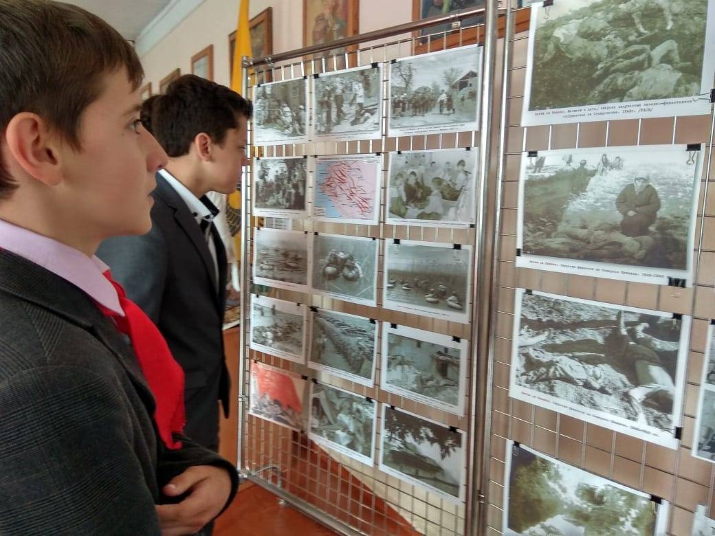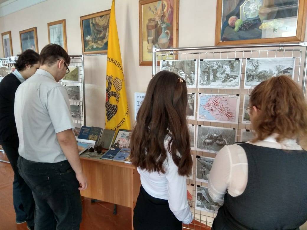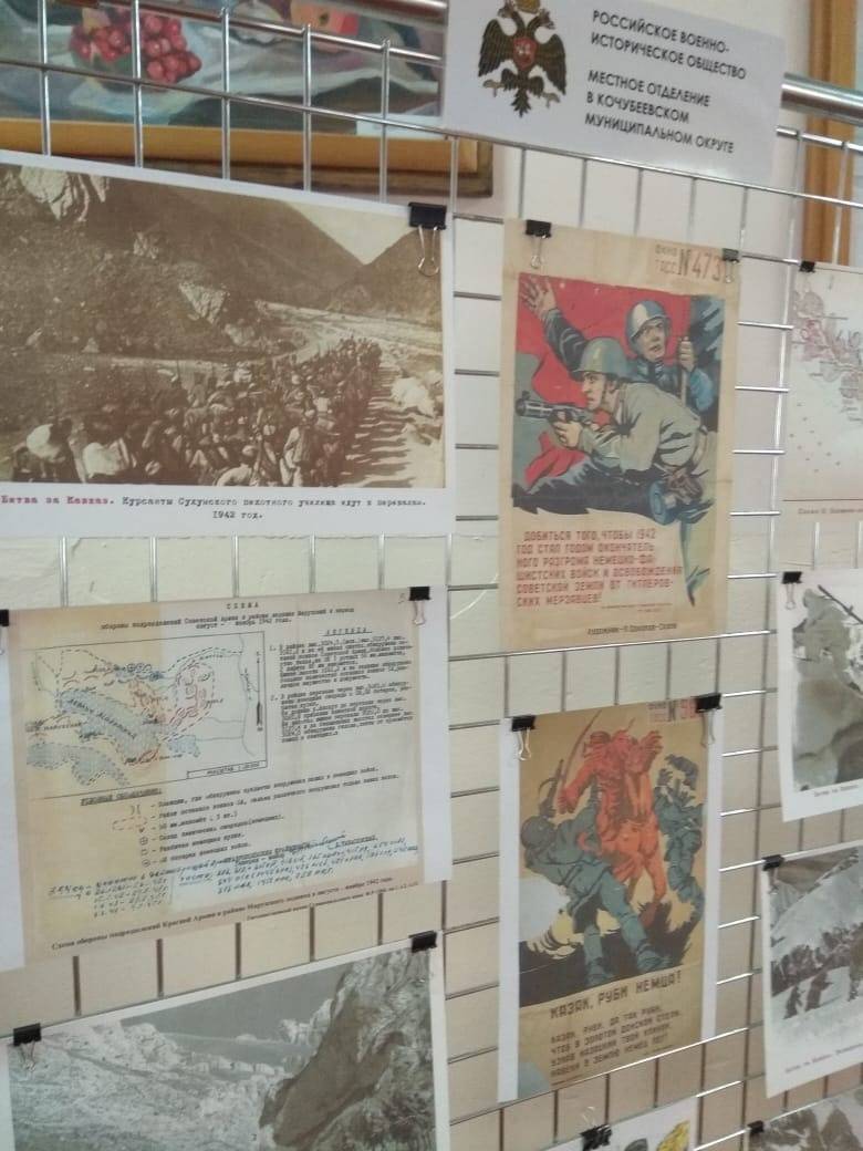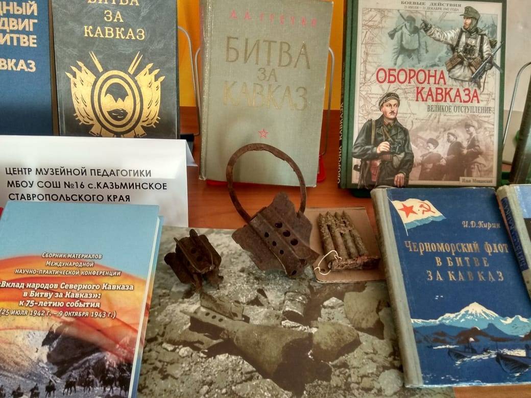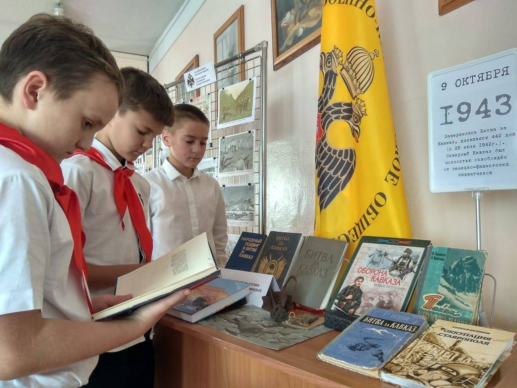 Школьники могут ознакомится с фотографиями военных лет, отражающими как боевые действия, так и жизнь на оккупированных территориях. Выставка содержит также картографический материал, позволяющий понять масштаб и значимость Битвы за Кавказ. Также учащиеся имеют возможность напрямую прикоснутся к предметам, найденным на полях сражений, которые хранятся в фондах школьного музея. Экспозиция сопровождается подборкой литературой по соответствующей тематике. Здесь представлены как советские издания, так и современные, вышедшие в том числе под эгидой РО РВИО СК.