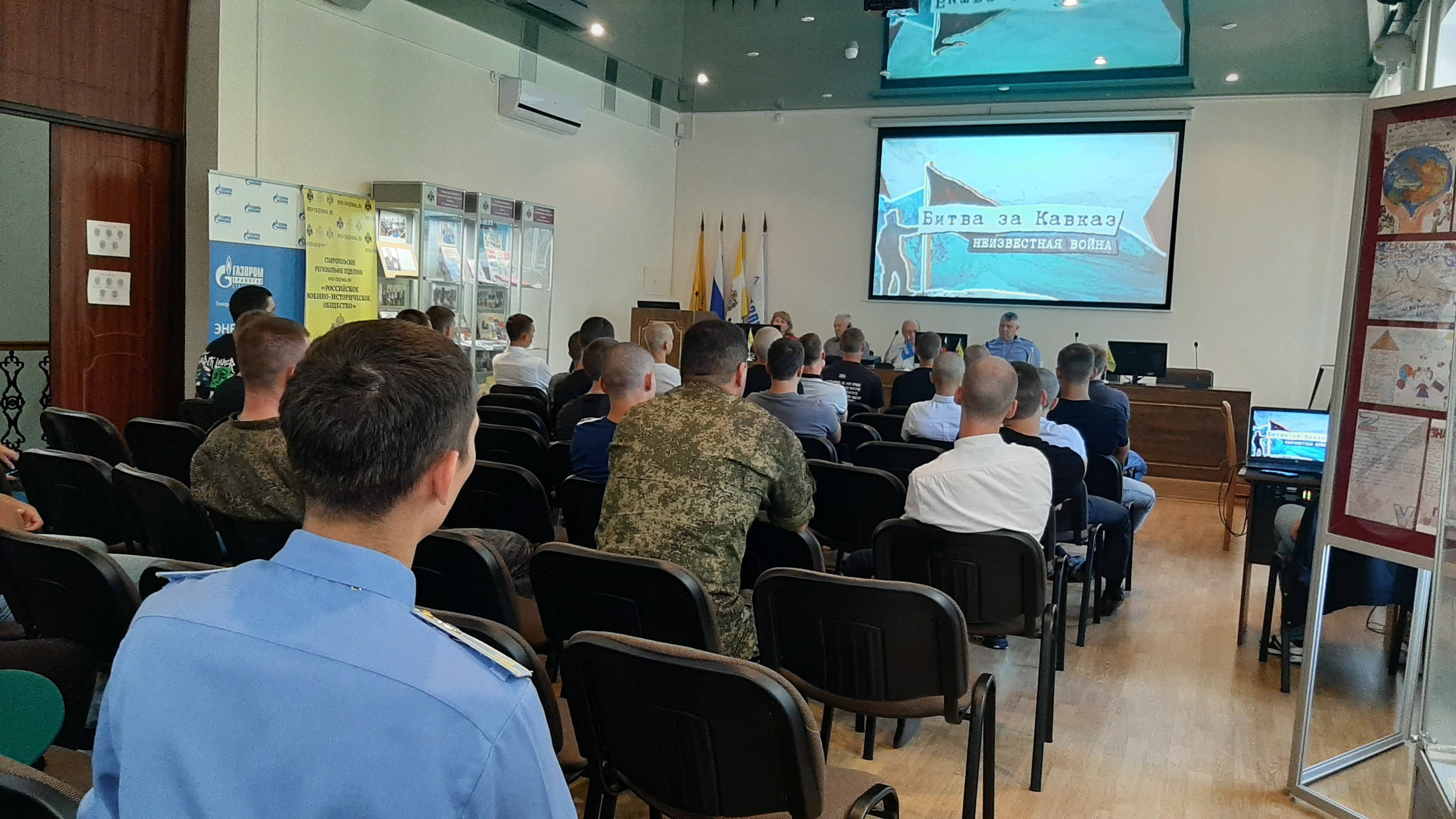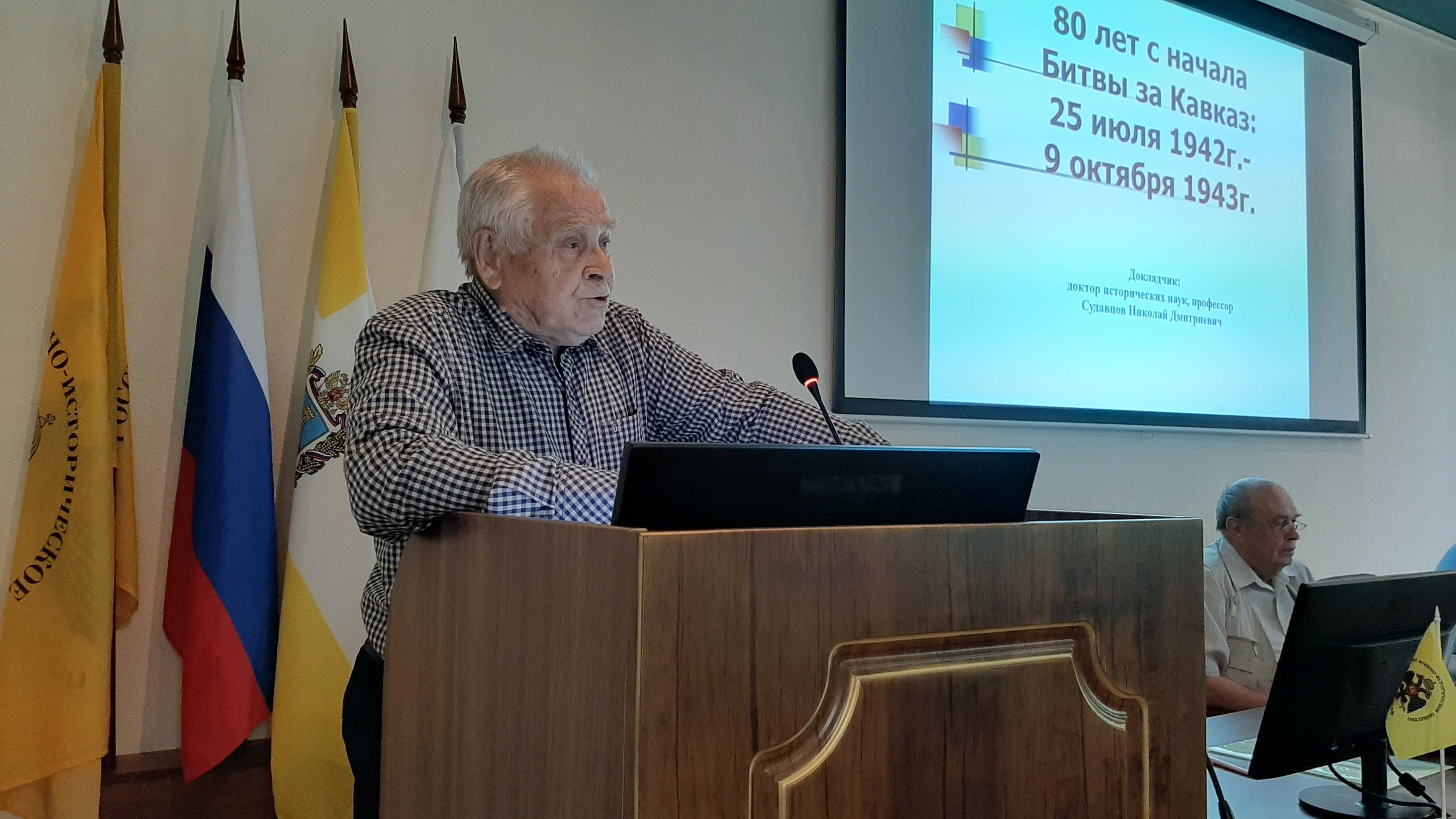Основным докладчиком выступил Н.Д. Судавцов. Он рассказал о начале Битвы за Кавказ, о ее значении в ходе Великой Отечественной войны, о целях германского командования, отметил важное значение Кавказа в целом, уделив отдельное внимание большой роли нефтяных месторождений Кавказа. Судавцов Н.Д. в ходе своего рассказа перечислил имена ставропольцев – Героев Советского Союза, удостоенных этого высокого звания за героическую защиту Кавказа. Он предложил собравшимся более подробно ознакомиться с биографиями Героев, воспользовавшись электронным ресурсом «Историческая память Ставрополья», разработанного РО РВИО СК совместно со Ставропольским государственным музеем-заповедником.