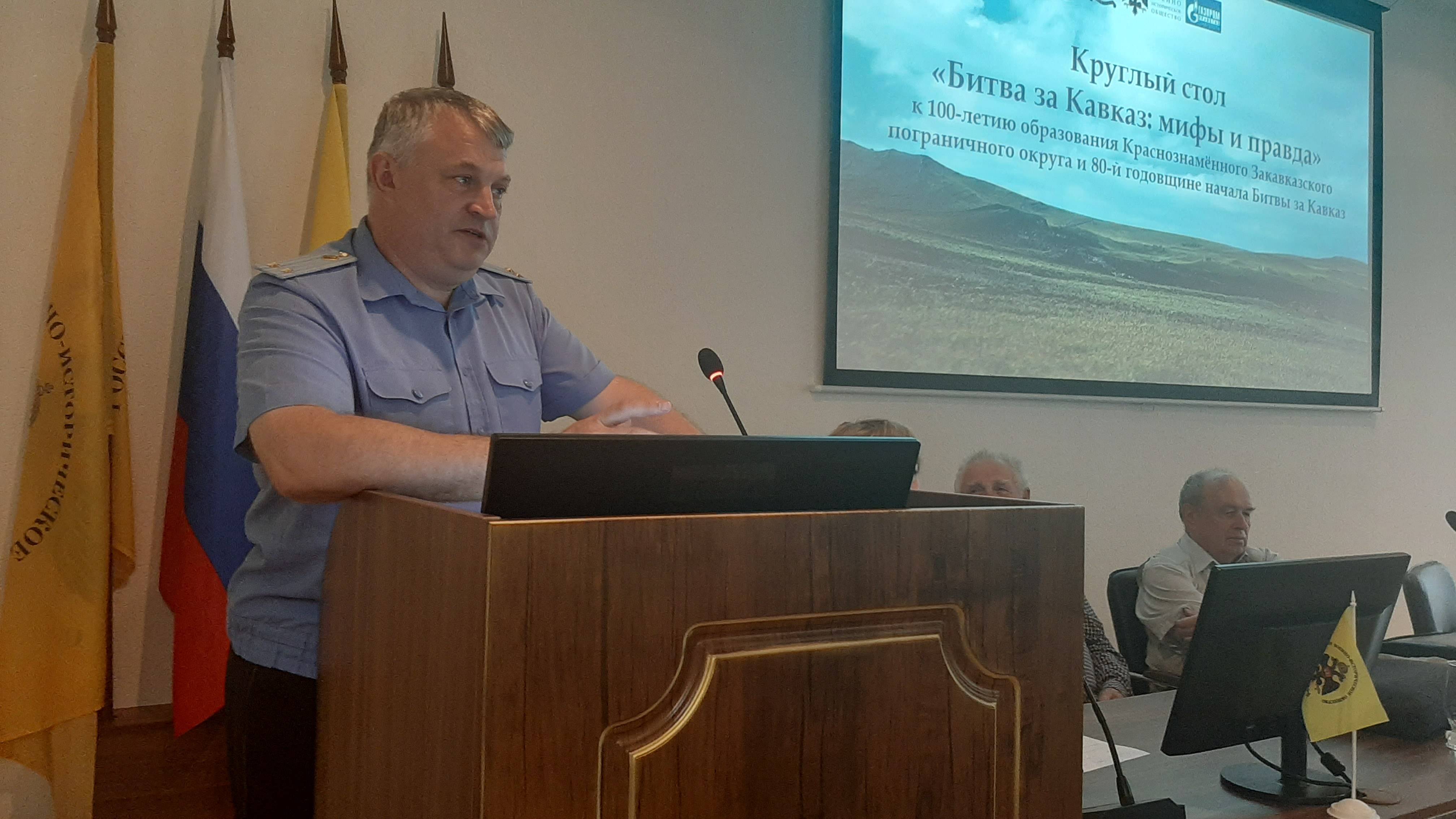В ходе круглого стола с докладом выступил А.А. Лесных, который рассказал о деятельности пограничных отрядов в Битве за Кавказ, о формировании пограничных частей, а также о 100-летней истории развития Закавказского пограничного округа.