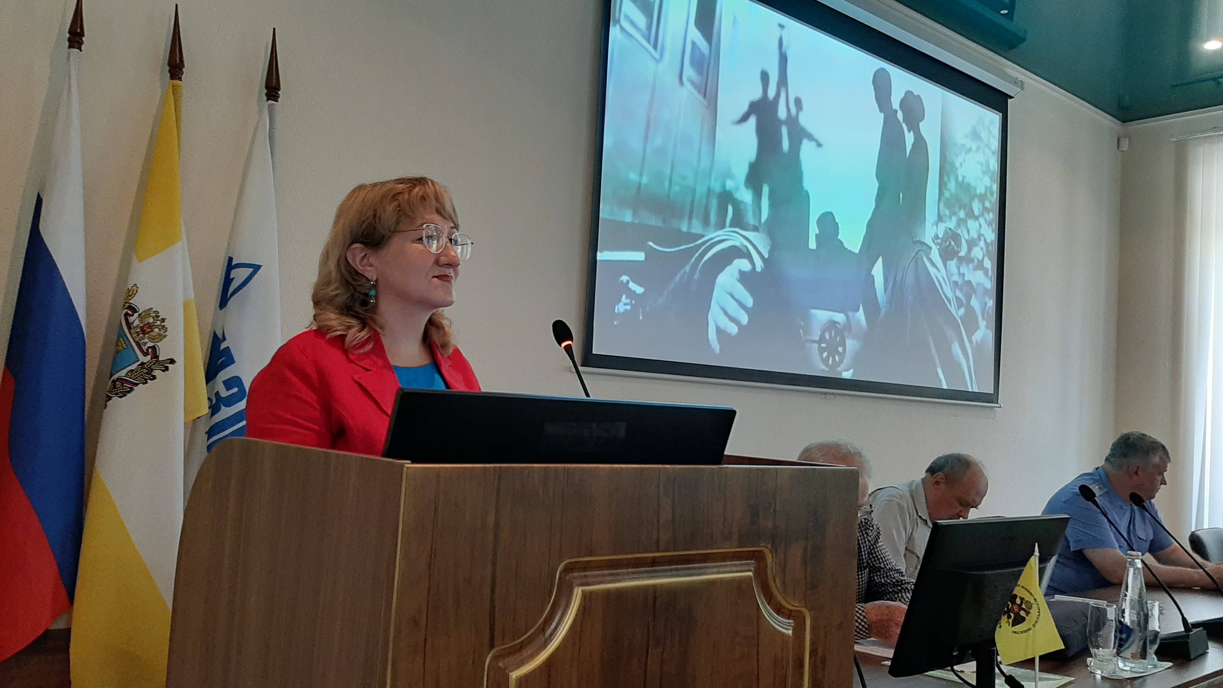 Ведущей круглого стола стала Е.Н. Стрекалова, к.и.н., доцент кафедры истории России СКФУ, старший научный сотрудник отдела военной истории и патриотической работы СГМЗ, член РО РВИО СК.