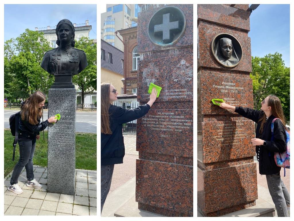Так, в г. Ставрополе представители РО РВИО СК, сотрудники отдела военной истории и патриотической работы Ставропольского государственного музея-заповедника (СГМЗ) провели уборку возле памятников и бюстов, установленных Российским военно-историческим обществом в краевой столице. Были приведены в порядок бюсты: героини Первой мировой войны Р.М. Ивановой, полного кавалера ордена Славы М.С. Наздрачевой, знаменитой летчицы Е.Д. Бершанской, видного государственного деятеля, академика Н.А. Семашко, а также памятный знак трем медицинским сестрам Ю.П. Вревской, Р.М. Ивановой, М.С. Наздрачевой и мемориал летчикам-авиаторам.
