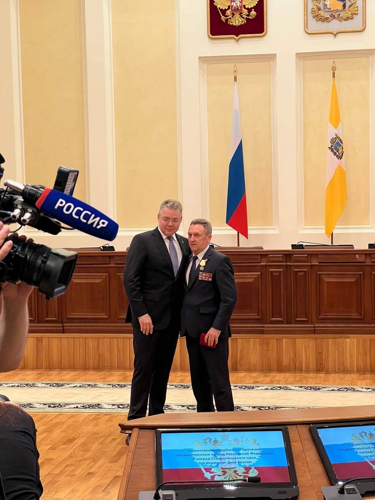Накануне Дня России состоялось торжественное вручение государственных и краевых наград. В числе награждаемых были члены Регионального отделения Российского военно-исторического общества в Ставропольском крае (РО РВИО СК): Борисенко Н.И., председатель Ставропольского краевого отделения Всероссийской общественной организации ветеранов «Боевое братство», и Сухомлинов С.А., заместитель руководителя отдела по противодействию терроризму и взаимодействию с правоохранительными органами Комитета общественной безопасности Администрации г. Ставрополя, ветеран боевых действий.