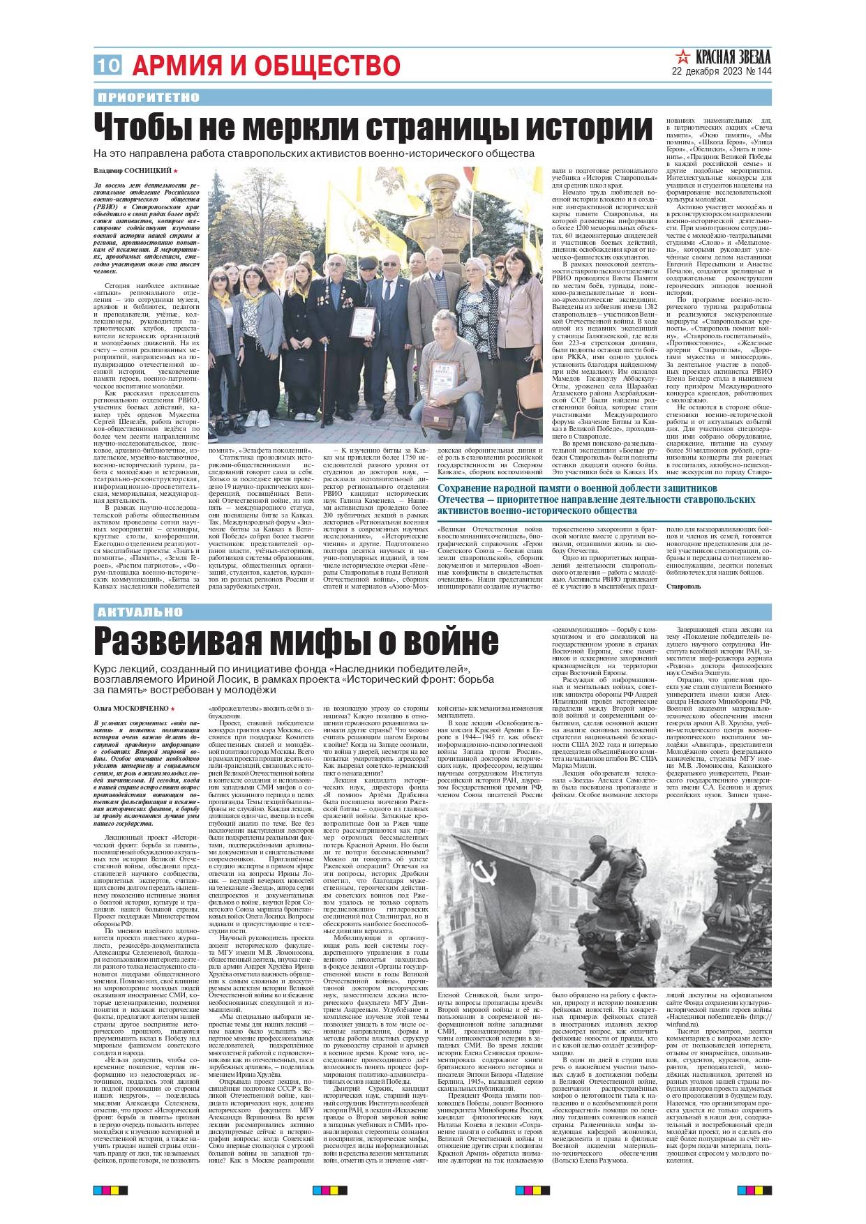 22 декабря 2023 года вышел свежий выпуск газеты «Красная Звезда» Вооруженных Сил Российской Федерации. В данном выпуске опубликована статья «Чтобы не меркли страницы истории» о деятельности Регионального отделения Российского военно-исторического общества в Ставропольском крае (РО РВИО СК).