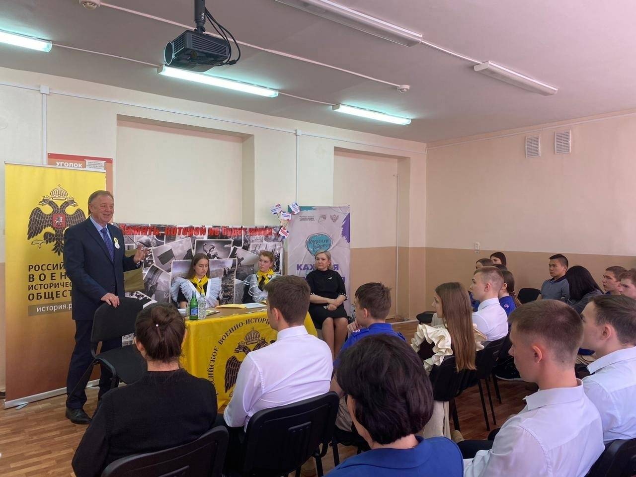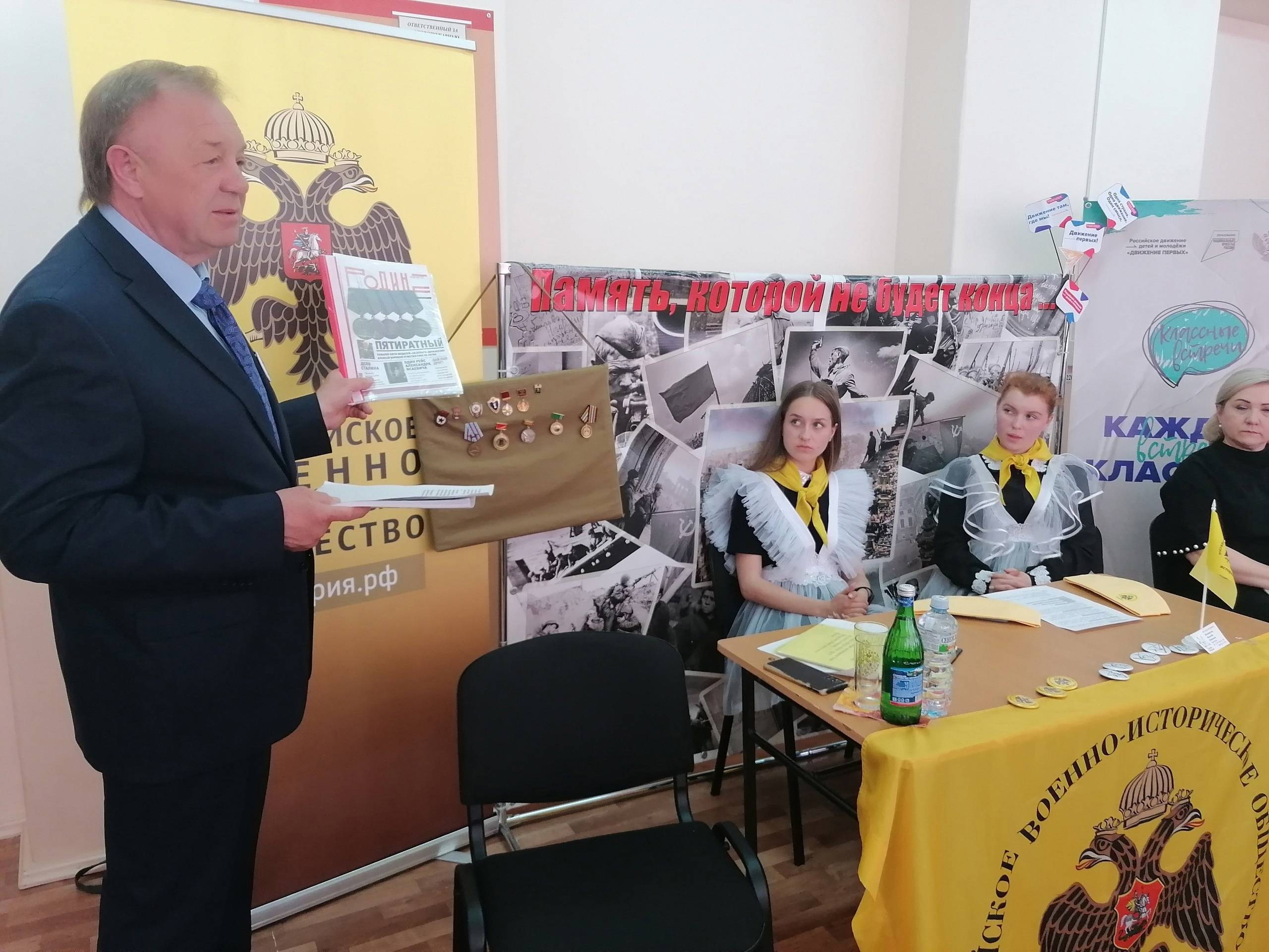 Члены Местного отделения РО РВИО СК в Изобильненском городском округе, члены клуба «Юный патриот» РО РВИО СК в День музеев провели встречу с учащимися и педагогами МБОУ СОШ №8 им. А.В. Грязнова с. Тищенского (директор член РО РВИО СК – С.С. Князева). Мероприятие было посвящено истории военно-исторического общества с императорских времён и до наших дней. Председатель Отделения Н.И. Щендригин рассказал о том, зачем было создано это общество, во имя каких целей, какую работу сегодня проводит Региональное отделения в нашем крае и в частности Местное отделение в Изобильненском округе.