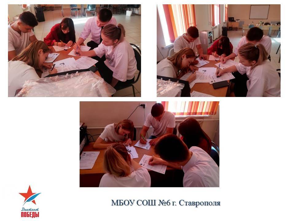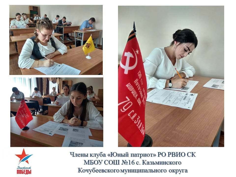 В акции приняли участие сотни учащихся – члены клуба «Юный патриот» РО РВИО СК под руководством активистов организации (среди них: МБОУ СОШ №6 г. Ставрополя под руководством Анисимовой А.Б., МБОУ СОШ №7 г. Ставрополя под руководством Тюриной Е.Н. и Горелик Н.В., МБОУ СОШ №16 с. Казьминского Кочубеевского муниципального округа под руководством Котова С.Н., МКОУ СОШ №11 с. Константиновского Петровского городского округа под руководством Теряевой Ю.В. и мн. др. уч. заведений). Школьники показали и актуализировали свои знания о событиях Великой Отечественной войны.