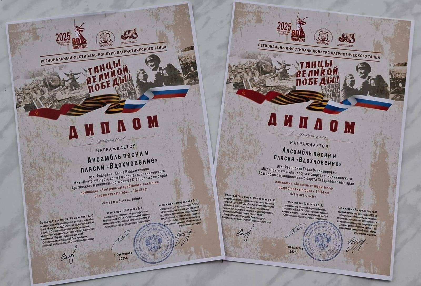 22 марта 2025 г. в г. Светлограде состоялся третий зональный этап регионального фестиваля-конкурса патриотического танца «Танцы Великой Победы!», в котором принял участие ансамбль песни и танца «Вдохновение» (руководитель – Федоренко Е В., член РО РВИО СК) Центра культуры, досуг и спорта с. Родниковского (директор – Иванько Н.И., член РО РВИО СК). Ребята, члены клуба «Юный патриот РО РВИО СК, выступили в двух номинациях, представив две танцевальные композиции. Всего в фестивале-конкурсе приняли участие около тысячи талантливых ребят из нескольких округов Ставрополья. По итогам мероприятия ансамбль из с. Родниковского стал дипломантом I степени в номинации «Этот День мы приближали, как могли» с танцевальной композицией «Когда мы были на войне» и дипломантом II степени в номинации «За ясным солнцем вслед» с композицией «Матушка-земля».